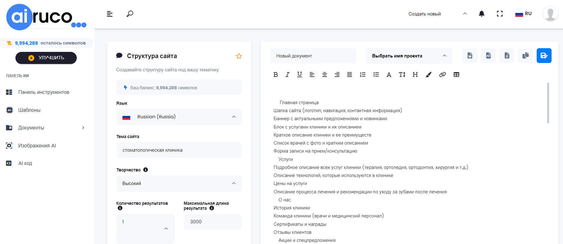 сетях Это лишь примерная структура сайта стоматологической клиники, и в зависимости от особенностей конкретной клиники, можно вносить изменения и дополнения. Важно, чтобы все страницы были логично структурированы, удобны в использовании и информативны для посетителей сайта. Даже комментарий выдал))) Не знаю как вы, я впечатлен. Ожидал какую-то стандартную, не 100% релевантную и не такую подробную выдачу от ИИ. Серьезно. У нас в компании есть отдел веб-разработки и я видел, сколько времени тратят ребята, чтобы создать для клиента структуру сайта. Сложно представить, сколько часов у них ушло бы на то, чтобы создать подобную структуру: погрузиться в бизнес, изучить информацию, посмотреть примеры подобных ниш, проанализировать путь клиента и собрать подходящий вариант. Да, сегодня искусственный интеллект наступает на пятки не только копирайтерам (это вообще отдельная история), но и специалистам в различных сферах, связанных с IT. Хочу отметить такой момент. Не факт, что первая же выдача удовлетворит ваш запрос на 100%, т.к. на один и тот же запрос ИИ может выдать объем текста различающийся в 2-3 раза. Соответственно, и содержательная часть будет разная. Именно поэтому, если с первого раза не получилось, делайте один и тот же запрос 2-3 раза. И, либо вы получите идеал, который даже не нужно дорабатывать. Либо, как минимум, сможете из двух-трех вариантов собрать свой «идеал». Что примечательно, видимо, зная эту особенность работы нейросети, разработчики airuco уже предусмотрели такую фишку — возможность сразу указать, какое количество вариантов контента должна сгенерировать нейросеть. Поэтому, пользуйтесь данной функцией для получения релевантного контента высокого качества. Процесс создания структуры сайта с помощью airuco максимально прост, не требуются какие-то глубокие знания и интерфейс настолько интуитивно понятен, насколько это вообще возможно. Небольшая инструкция, как создать структуру своего будущего сайта с помощью ИИ airuco: Итак, чтобы создать структуру своего сайта, выберите шаблон «Структура сайта» Далее, чтобы получить контент от нейросети, нужно ввести тематику сайта (здесь, чем подробнее вы опишете, тем лучше будет результат. Например, если вы введете airuco: «компания по продаже автомобилей» будет одна выдача, а если «компания по продаже автомобилей trade-in» совсем другая, если «компания по продаже автомобилей — официальный дилер и сервис» — третья. Выберите степень «творчества». К слову, я всегда выбираю максимальный вариант. Как я уже упоминал выше, лучше выбрать выдачу сразу двух-трех результатов, чтобы либо выбрать наиболее удачный, либо из них собрать один классный вариант. Объем выдачи в символах я как правило, не меняю, оставляю по умолчанию 3000. Только если например, генерирую заголовки, то уменьшаю. Все, что осталось — нажать на кнопку «Генерировать» и ждать результат. Стоит отметить, что нейросеть какое-то время «думает», поэтому, не стоит снова и снова жать на кнопку, если через пару секунд у вас не появился ответ нейросети-копирайтера. Поверьте, живой копирайтер думал бы над вашим текстом намного дольше. Нажимая несколько раз вы отправите запрос ИИ несколько раз и потом получите больше контента на один запрос, чем вам было нужно. Еще и символы потратятся, поэтому, терпение! *** Все, ответ готов, и вам, как главному редактору, ост