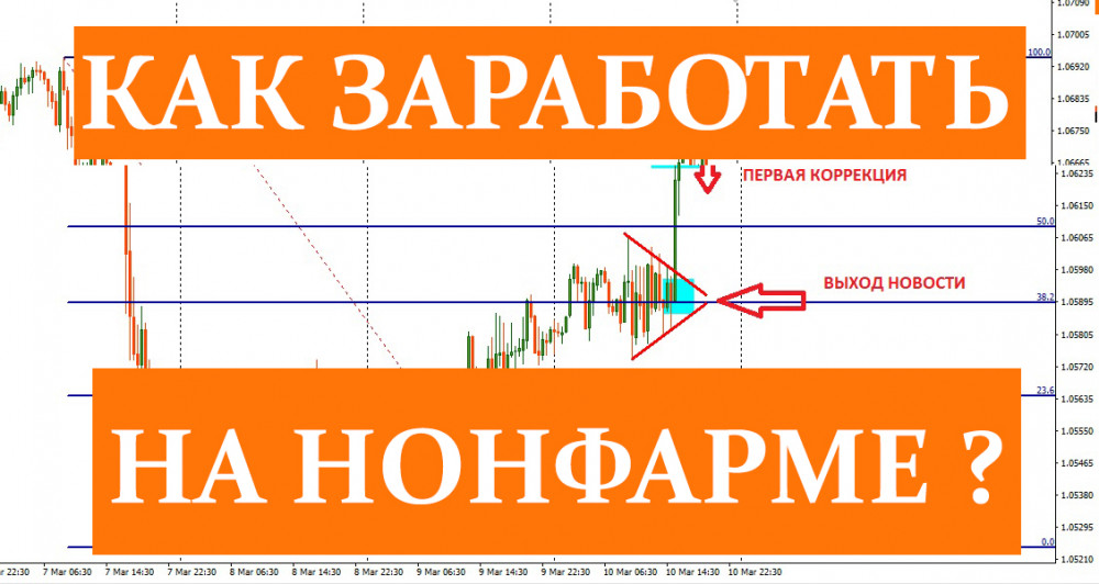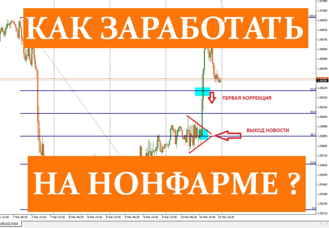 Давайте посмотрим на график: Как заработать на нонфарме, пример Стрелками я показал момент выхода новости, кстати новость была положительная для доллара, а значит негативная для EUR/USD. Многие кто ожидал что евродоллар будет падать, обжёгся. Это значит, что календарь экономических новостей и данные в нём не являются приоритетом для принятия решения о покупке или продаже актива. Итак, после выхода цена пошла вверх. Если цена идёт вверх, это означает что у неё будут коррекции вниз. Когда ожидать коррекцию? Конечно же, около линии сопротивления. Как правильно определять линии поддержки и сопротивления знают немногие, об этом я обучаю в своих курсах. На графике я показал уже готовые линии сопротивления. Около них я ожидал разворота и снижения цены, чтобы заработать на ордерах SELL. Рассмотрим эти моменты поближе. Как заработать на нонфарме, точные сигналы На этом графике видно, что, несмотря, на сильное движение вверх после выхода новости, евродоллар остановился около как минимум двух линий сопротивления и откорректировался вниз на 200-300 пунктов. Это и дало мне возможность заработать буквально за несколько минут. Есть ли здесь подводные камни? Конечно есть, об этом я рассказываю в своих курсах. Но вы можете всегда получать готовые сигналы бесплатно в моих аналитических выпусках по понедельникам на моём ютуб-канале. Главное, не сомневаться, что вы тоже сможете заработать на рынке. Рынок работает 24/5 и каждый может получать с него прибыль работая удалённо, тем более в наше непростое время. Открывайте счёт у брокера и пишите мне в телеграм, я дам вам хороший денежный бонус для хорошего начала торговли. Удачи в трейдинге!
