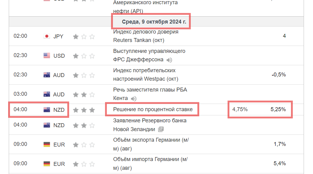 Так в среду, девятого октября, в четыре утра по мск будет новость: Решение по процентной ставке новозеландского центробанка. Предыдущее значение было пять и двадцать пять процента, а прогнозируется четыре и семьдесят пять процентов и я вам скажу это немало! Обычно снижение происходит на двадцать пять базисных пунктов, а в этот раз — пятьдесят базисных пунктов! Это очень много и поэтому с высокой вероятностью курс новозеландского доллара по отношению к доллару сша (NZDUSD) в момент выхода этой новости может упасть! Чтобы не пропустить эту новость подписывайтесь на мой телеграмм канал, потому что за тридцать минут до выхода этой новости я вас и предупрежу и мы вместе на этом заработаем.
