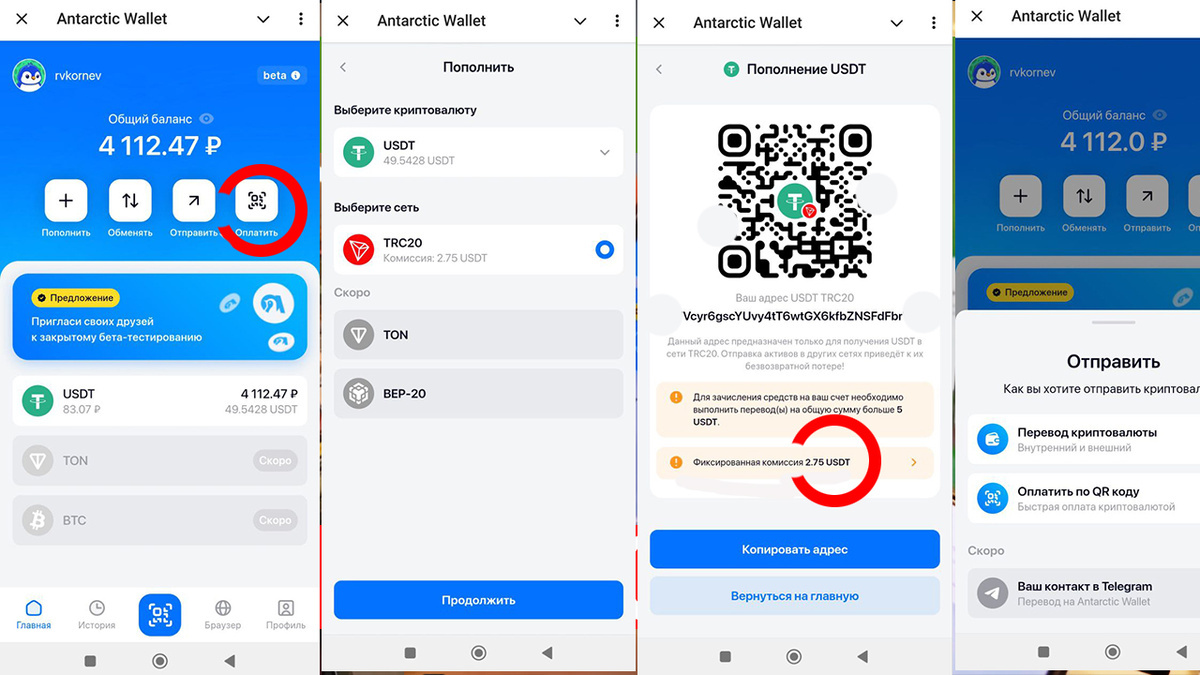 Лично мне нет необходимости покупать криптовалюту, так как я получаю доход в USDT, торгуя на бирже. Однако раньше мне приходилось постоянно менять крипту на рубли через сервисы P2P, что создавало неудобства — однажды даже банк заблокировал мой счёт за такие операции. Новый криптокошелёк решил эти проблемы: теперь можно просто расплачиваться криптовалютой на кассе, просто сканируя QR-код. Что касается функционала кошелька Антарктик, его можно запустить и использовать прямо в Телеграме. Чтобы не искать его каждый раз, просто закрепите чат с ботом, и он всегда будет под рукой. На главной панели приложения вы увидите четыре основные кнопки: пополнить, обменять, отправить и оплатить. Для пополнения кошелька можно использовать любой другой криптокошелёк — достаточно выбрать сеть TRC20, ввести адрес из своего кошелька и отправить средства. Например, я вывожу прибыль с брокерского счёта прямо в этот кошелёк, и мне больше не нужно конвертировать крипту в рубли. Вы также можете выводить деньги на внешний кошелёк, а если пересылаете средства внутри Антарктика другому пользователю, комиссии не взимается. Хотя за ввод средств есть фиксированная комиссия в 2,75 USDT, её уровень остаётся неизменным, что делает её выгодной при крупных пополнениях. Чтобы расплатиться в магазине или кафе, достаточно нажать кнопку «Оплатить», после чего откроется сканер QR-кода. Просто наведите его на код на терминале, и оплата произойдёт практически мгновенно, со автоматической конвертацией в рубли. Курс немного ниже, чем на P2P-обменниках, но за такое удобство вполне можно смириться с небольшой потерей. Теперь нет необходимости обналичивать USDT в России — можно просто делать покупки, расплачиваясь криптой везде, где принимаются QR-коды, а это почти все места с терминалами Сбербанка и других банков. Также предусмотрена защита вашего кошелька: вы сможете установить PIN-код для входа в приложение, что создаёт спокойствие за ваши средства. Однако недавно заработала новая функция: можно выводить крипту путём автоматического обмена, прямо на рублёвую карту! Это круто, так как полностью избавляет вас пользоваться P2P сервисами криптобирж, где очень много мошенников и много моих знакомых попалось на их уловки. Здесь без всяких посредников вы мгновенно получаете рубли на карту.