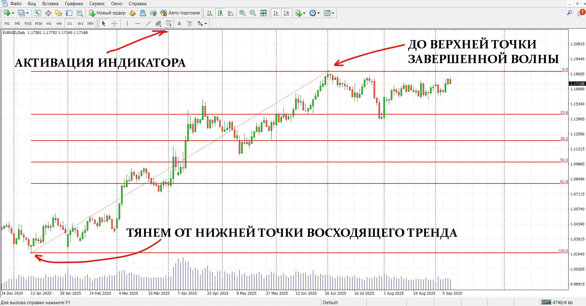 Индикатор основан на числах Фибоначчи, которые представляют собой последовательность, где каждое следующее число — это сумма двух предыдущих (например, 0, 1, 1, 2, 3, 5, 8 и так далее). В трейдинге используются определенные проценты из этой последовательности, такие как 23.6%, 38.2%, 50%, 61.8% и 100%. Эти уровни помогают определить, где цена может остановиться или развернуться.