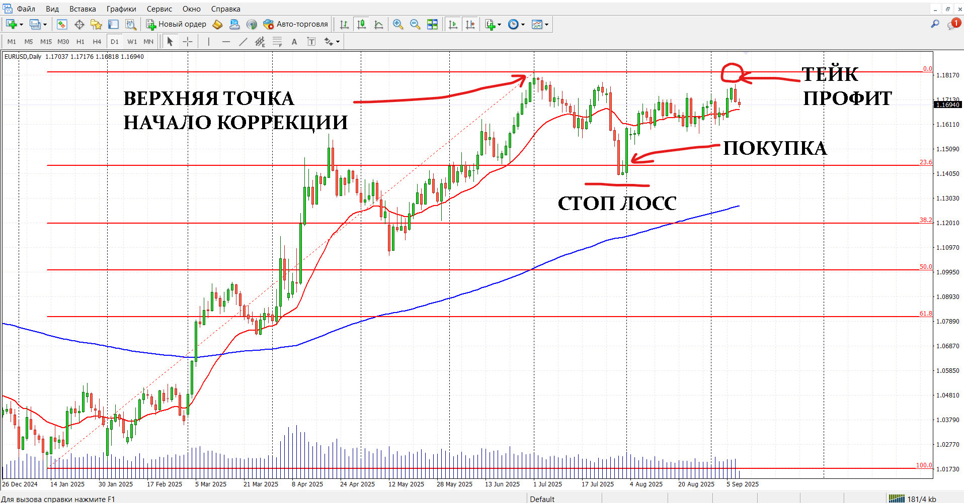 На примере вы видите восходящий тренд. Началась коррекция цена отбилась от уровня поддержки в виде линии Фибоначчи 23.6. От нее покупаем, выставляя стоп лосс ниже 23.6, а тейк профит около 0. При нисходящем тренде, действуем наоборот, используя уровни для продажи.