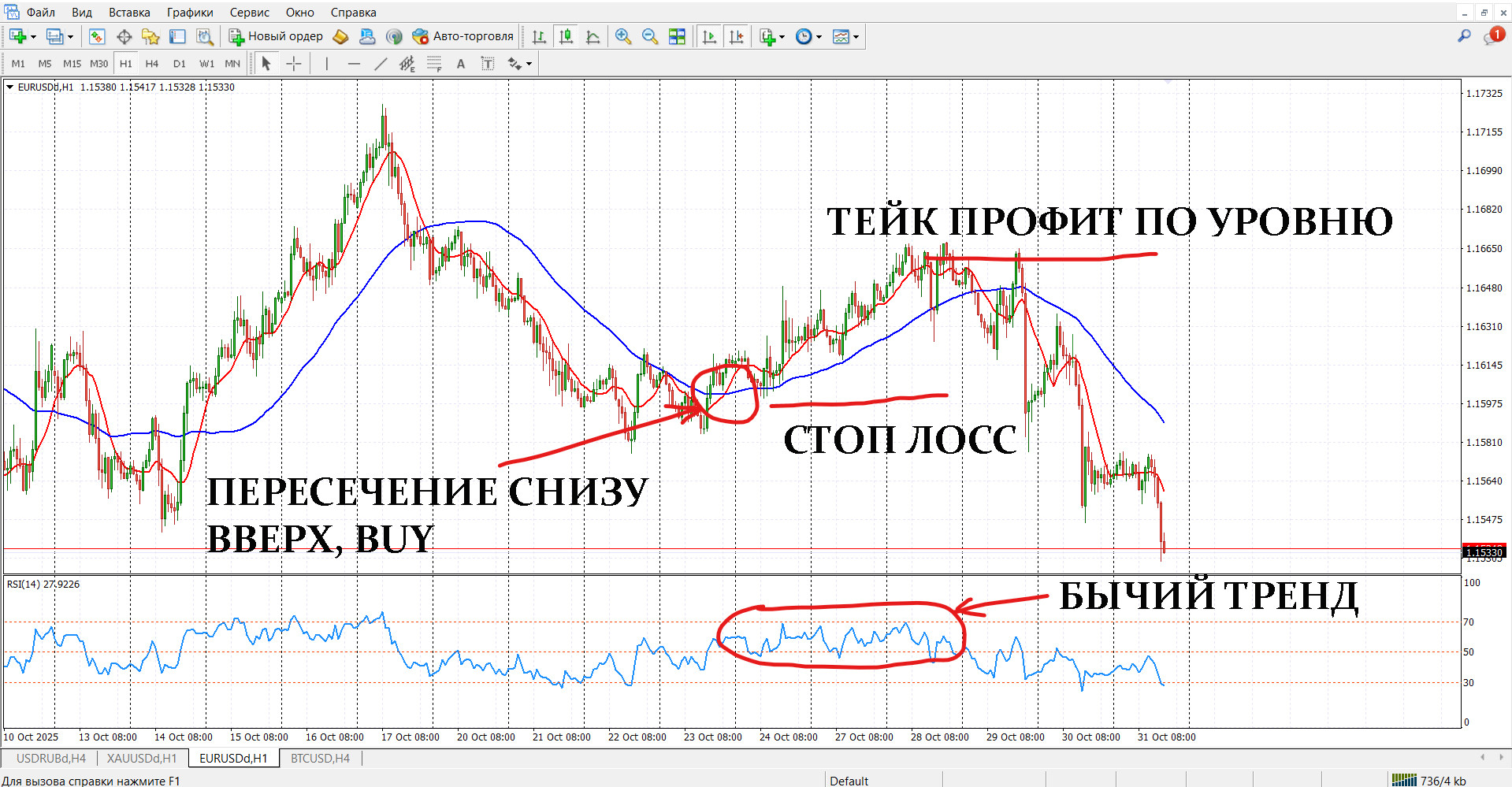 Для покупки 1. Смотрим на скользящие средние: Если 10-периодная SMA пересекла 50-периодную SMA снизу вверх, это сигнал к покупке. 2. Проверяем RSI: Убедитесь, что RSI выше 30. Если он ниже 30, это значит, что рынок может быть перепродан, и лучше подождать. Пример: Если вы видите, что 10-периодная SMA пересекает 50-периодную SMA и RSI направлен вверх, тогда можно открывать позицию на покупку. Для продажи 1. Смотрим на скользящие средние: Если 10-периодная SMA пересекла 50-периодную SMA сверху вниз, это сигнал к продаже. 2. Проверяем RSI: Убедитесь, что RSI ниже 70. Если он выше 70, это значит, что рынок может быть перекуплен. Пример: Если 10-периодная SMA пересекает 50-периодную SMA и RSI направлен вниз, вы можете открывать позицию на продажу. 1. Стоп-лосс: Устанавливайте стоп-лосс ниже последнего минимума для покупок и выше последнего максимума для продаж. Это поможет защитить ваши средства от больших потерь. 2. Тейк-профит: Закрывайте сделку, когда достигнете заранее установленного уровня прибыли. Например, используйте соотношение 1:2. Если ваш стоп-лосс составляет 20 пунктов, ставьте тейк-профит на 40 пунктах. Этап Действие Покупка SMA(10) пересекает SMA(50) снизу вверх, RSI > 30 Продажа SMA(10) пересекает SMA(50) сверху вниз, RSI < 70 Стоп-лосс За локальным минимумом для покупок или за локальным максимумом для продаж Тейк-профит Соотношение 1:2 или по обратному пересечению скользящих средних Используя эту простую стратегию, вы, даже в начале пути, сможете с уверенностью подходить к торговле на Forex в MetaTrader. Не забывайте, что практика ведет к совершенству, так что пробуйте различные подходы и адаптируйте стратегию под свои нужды! А чтобы узнать больше обратите свое внимание на мой бесплатный курс по трейдингу для начинающих. И подписывайтесь на мой телеграм канал, чтобы оставаться в курсе всех тенденций и новостей финансовых рынков. Успешной торговли и высоких профитов!