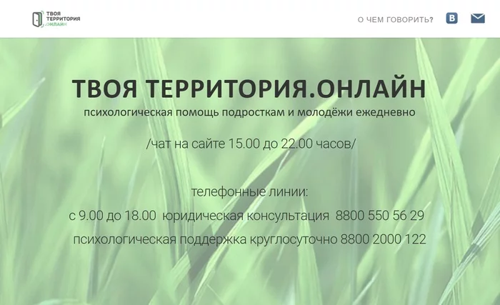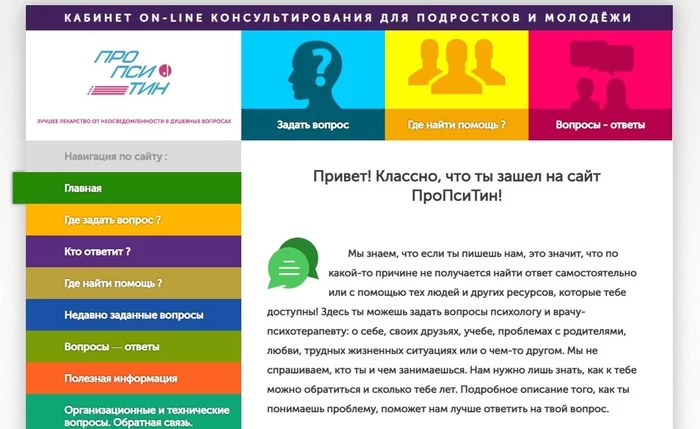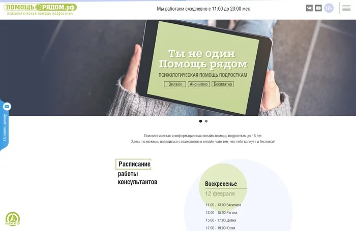 Служба работает с 2012 года. Это один из первых в России ресурсов, предоставляющий подросткам бесплатную психологическую помощь в онлайн-формате. Профессиональные психологи ежедневно готовы выслушать, поддержать и помочь. На сайте молодой человек или девушка может свободно и конфиденциально поговорить с психологом о том, что их волнует, получить квалифицированную психологическую консультацию или информационную поддержку.
