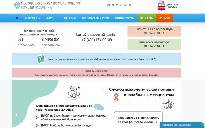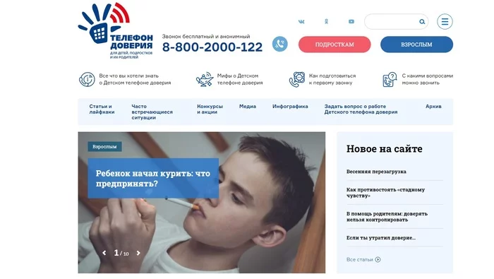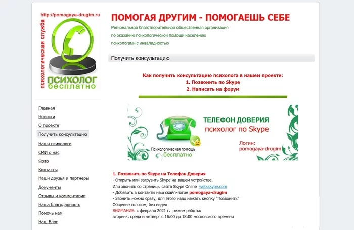 Волонтёрский проект ежедневной бесплатной анонимной психологической помощи подросткам и молодёжи. Консультирование проводят профессиональные психологи через онлайн-чат. Можно не указывать своё настоящее имя, полная конфиденциальность гарантируется. Обсудить можно любые волнующие проблемы и темы, от неразделенной любви или отношений с окружающими до депрессии и проявлений жестокости и насилия. ПроПсиТин был изначально был создан для тинэйджеров Ставропольского края, попавших в трудную жизненную ситуацию. Сейчас он работает как всероссийский кабинет on-line консультирования для подростков и молодёжи. Ребята могут задать любой животрепещущий для них вопрос, попросить помощи в сложной ситуации, с которой они не могут справиться самостоятельно. На все вопросы психологи сайта дают развернутые ответы, помогают найти выход или получить необходимую помощь. Особую ценность представляют сотни статей и ответов на самые важные для подростков темы, которые легко находятся по тегам. На множество вопросов можно найти ответ сразу же. Бесплатная психологическая поддержка людей до 20 лет, столкнувшихся с сексуализированным насилием. Работает с 2019 года. Это объединение независимых психологов, которые считают сексуализированное насилие над детьми и подростками очень важной проблемой и умеют с ней работать. Не связаны с полицией или органами опеки. Команда профессиональных психологов консультирует детей и подростков в анонимном чате. Они готовы быть рядом, когда это необходимо. Если молодого человека или девушку что-то мучает, беспокоит, не с кем это обсудить, психологи-консультанты готовы выслушать, поддержать и помочь разобраться, выбрать верное решение. И всё это бесплатно, конфиденциально, анонимно. Во многих жизненных ситуациях подростку важно знать, что он всегда получит помощь и поддержку профессионального взрослого в привычном ему формате чата. Центр «НеТерпи» — объединение психологов-волонтеров, оказывающих бесплатную психологическую помощь. Команда состоит из профессиональных психологов с опытом консультирования от 2 до 25 лет. Все психологи прошли специальное обучение для оказания кризисной психологической помощи, работы с пострадавшими и авторами насилия. Благотворительная общественная организация «Помогая другим — помогаешь себе». Бесплатную дистанционную психологическую помощь всем нуждающимся оказывают психологи с инвалидностью. Можно бесплатно позвонить по Телефону доверия через скайп или написать электронное письмо на форум. Психолог с инвалидностью — это новое социальное явление. Эти сильные духом люди с большим сердцем счастливы заниматься любимым делом. Тем самым они ощущают свою профессиональную востребованность и нужность людям. Для некоторых клиентов их опыт инвалидности служит дополнительным источником доверия. По телефону оказывается неотложная психологическая помощь. Бесплатные консультации длительностью 50 минут проводятся через Skype или ZOOM. Количество сессий ограничено — до 5 консультаций. Бесплатно для граждан РФ, относящихся к категориям населения, указанных в Правилах приема (на сайте). Для записи необходимо заполнить заявку на сайте и в назначенное время быть онлайн. Круглосуточный Детский телефон доверия на базе Федерального координационного центра по обеспечению психологиче