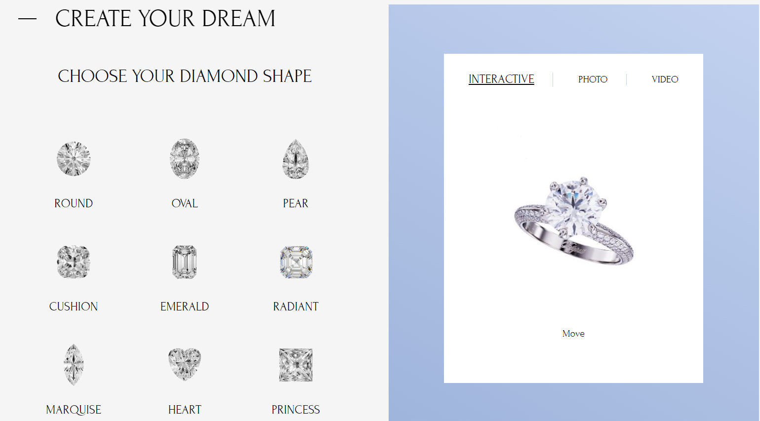 - Создать дизайн украшения с помощью конфигуратора, указав форму бриллиантов, их количество, драгоценный металл и прочие параметры;