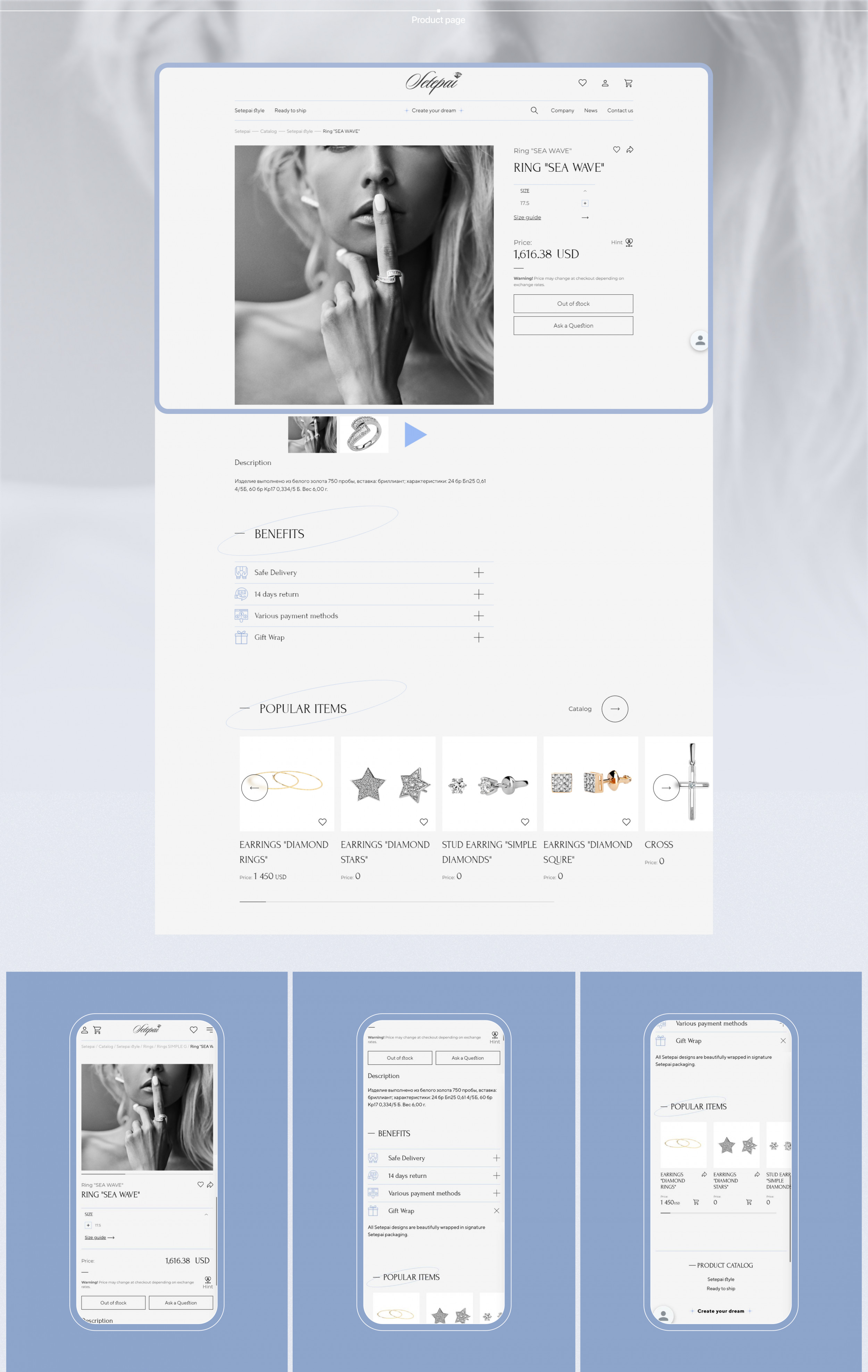 До начала работы с нами заказчик никогда не сталкивался с разработкой. Вместе с тем, у него был не совсем типичный запрос — он хотел создать не просто интернет-магазин украшений, а площадку, со встроенным конфигуратором ювелирных изделий.