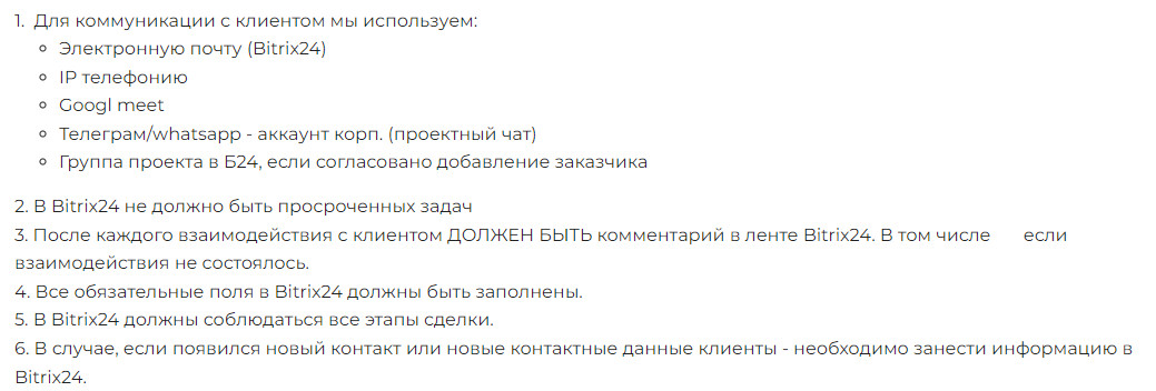 После нескольких таких случаев мы сменили подход к работе с техническим заданием. Сейчас мы сами тщательно собираем всю информацию, проводим интервью с командой клиента и принимаемся за работу, когда у нас для этого есть всё необходимое. Перед началом основной работы мы проводим качественное бизнес-интервью с заказчиком. Это позволяет менеджерам и аналитикам более глубоко погрузиться в проект и получить дополнительную информацию о перспективах его успешности и внешних рисках. Так выглядит информация о работе с ТЗ у нас в регламенте. Для успешной сдачи проекта необходимо ознакомить заказчика с основными этапами разработки сайта и согласовать все описанные пункты. Мы уже писали, что заключили договор с компанией «Росмэн». С клиентом мы провели эксперимент и добавили его в нашу систему Битрикс24. Это позволяет ему в любой момент отслеживать нашу работу. Такой подход особенно важен для тех компаний, у которых хорошо развит собственный IT-отдел. Раньше у нас возникали опасения по этому вопросу. Как же так? Разработчики будут видеть заказчиков, заказчики — разработчиков... Да, с одной стороны, прозрачность — здорово. С другой — почва для нервов и обсуждений. Но мы всё же решились на этот шаг, потому что нам важно быть продолжением заказчика, находиться с ним в одной команде и не ограничиваться ролями, прописанными на бумаге. Для того, чтобы организовать этот процесс, прежде всего необходимо создать командный дух в коллективе. Команда должна понимать, что заказчик — это не просто тот, для кого мы что-то делаем за деньги. Он обратился к нам за помощью, и поэтому важно отойти от привычных для многих компаний рамок «начальник и его подчинённые». Важно подготовить и заказчика к такому взаимодействию и на этапе подготовки понять сначала для себя, а возможно ли взаимодействовать с ним в таком формате. Ну и, конечно же, куда без автоматизации процессов по этой процедуре!