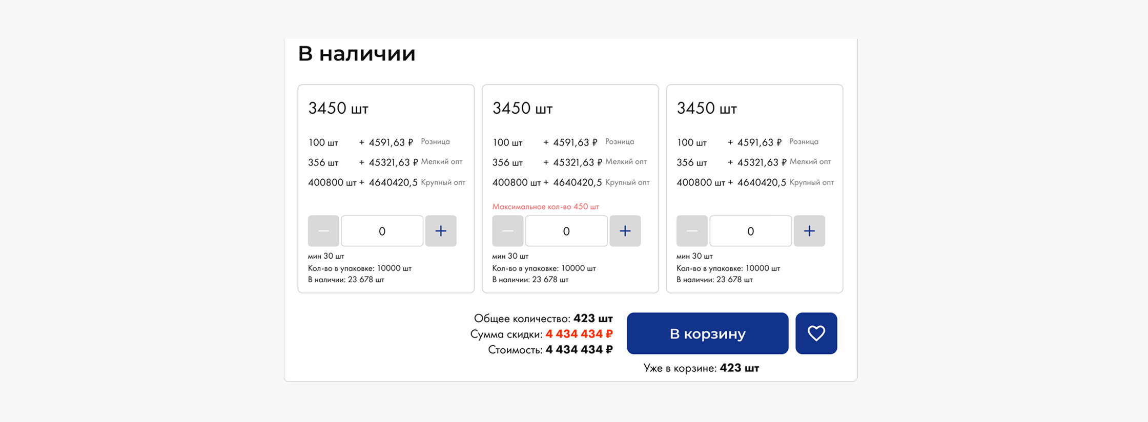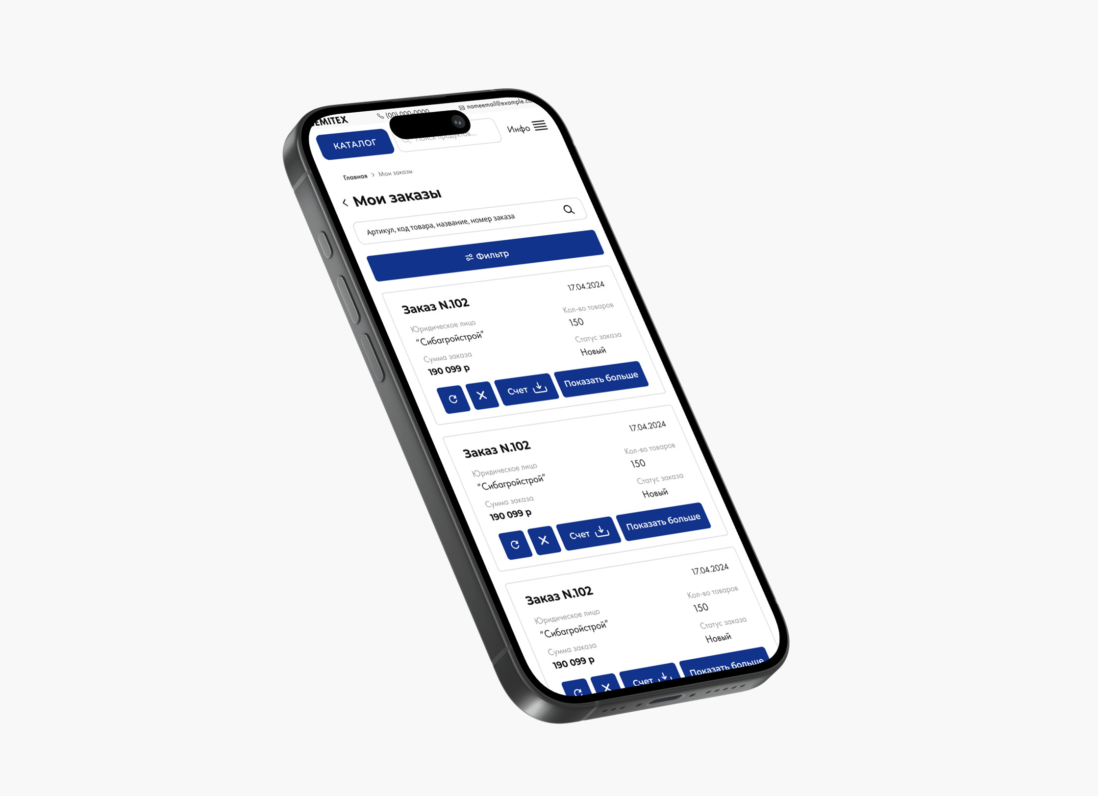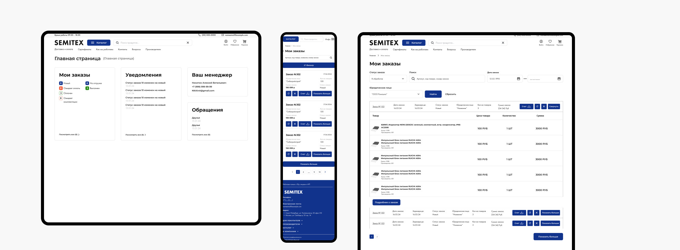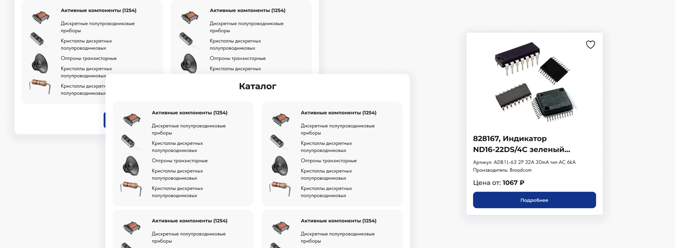 На первом этапе мы провели аудит бизнес-требований клиента и сопоставили их с возможностями платформы. Там, где стандартные модули не подходили, были запланированы кастомные доработки. Основной упор сделали на личный кабинет дилера — он стал полноценным рабочим пространством, а не просто витриной. Пользователь может оформлять заказы от нескольких юрлиц, сохранять шаблоны, видеть индивидуальные цены и делегировать права другим сотрудникам компании. Каталог был спроектирован с учетом специфики отрасли: изображения у компонентов играют второстепенную роль, на первом месте — характеристики, наличие и цена. Мы реализовали табличную верстку каталога и карточек, где все важные параметры видны сразу — без перехода внутрь карточки. Такой подход позволяет быстро сравнивать и добавлять позиции в заказ. Для получения актуальной информации о товарах мы разработали микросервисы, ежедневно парсящие прайсы и характеристики с сайтов поставщиков. Эти данные автоматически преобразуются в формат, совместимый с 1С, и далее попадают в интернет-магазин. Реализована защита от дублей, что обеспечивает чистоту базы. Также был доработан модуль ценообразования — он учитывает не только тип клиента и объем заказа, но и происхождение товара: со склада Semitex или напрямую от поставщика. Все цены корректно пересчитываются в рубли и отображаются за единицу товара, даже если в 1С они хранятся в долларах за тысячу штук. Поскольку многие компоненты продаются в упаковках — по 100, 500 или 1000 штук — мы реализовали калькулятор, который помогает соблюдать правила закупки. Система автоматически учитывает минимально допустимые объемы и остатки на складе. Например, если на складе 262 единицы товара, из которых две полные упаковки по 100 штук и одна открытая пачка с 62, система позволит оформить заказ на 200 или 162 единицы, но не на 263 или только 62. Такой подход исключает ошибки, упрощает контроль остатков и делает процесс заказа более прозрачным для клиентов. Для повышения удобства клиентов и снижения зависимости от конкретных артикулов реализована система подбора аналогов. Менеджеры могут настраивать приоритетные характеристики, по которым формируются предложения взаимозаменяемых компонентов — например, по сопротивлению, напряжению или форме корпуса. Это особенно важно при перебоях с поставками или обновлении модельного ряда. Чтобы обеспечить платформе Semitex возможность органического привлечения новых клиентов, мы уделили внимание технической оптимизации сайта. Были реализованы функции, обеспечивающие корректную индексацию страниц: настройка канонических URL, внутренняя перелинковка, оптимизация изображений, реализация структуры тегов и фильтров. Страницы каталога и карточек товаров прорабатывались с учетом ключевых поисковых запросов. Такой подход заложил устойчивый фундамент для будущего SEO-продвижения. Одним из барьеров для новых пользователей было обязательное наличие аккаунта. Мы внедрили функцию «моментальной регистрации», чтобы клиент мог оформить первый заказ без долгих формальностей. Это ускоряет воронку продаж и снижает порог входа для новых покупателей.