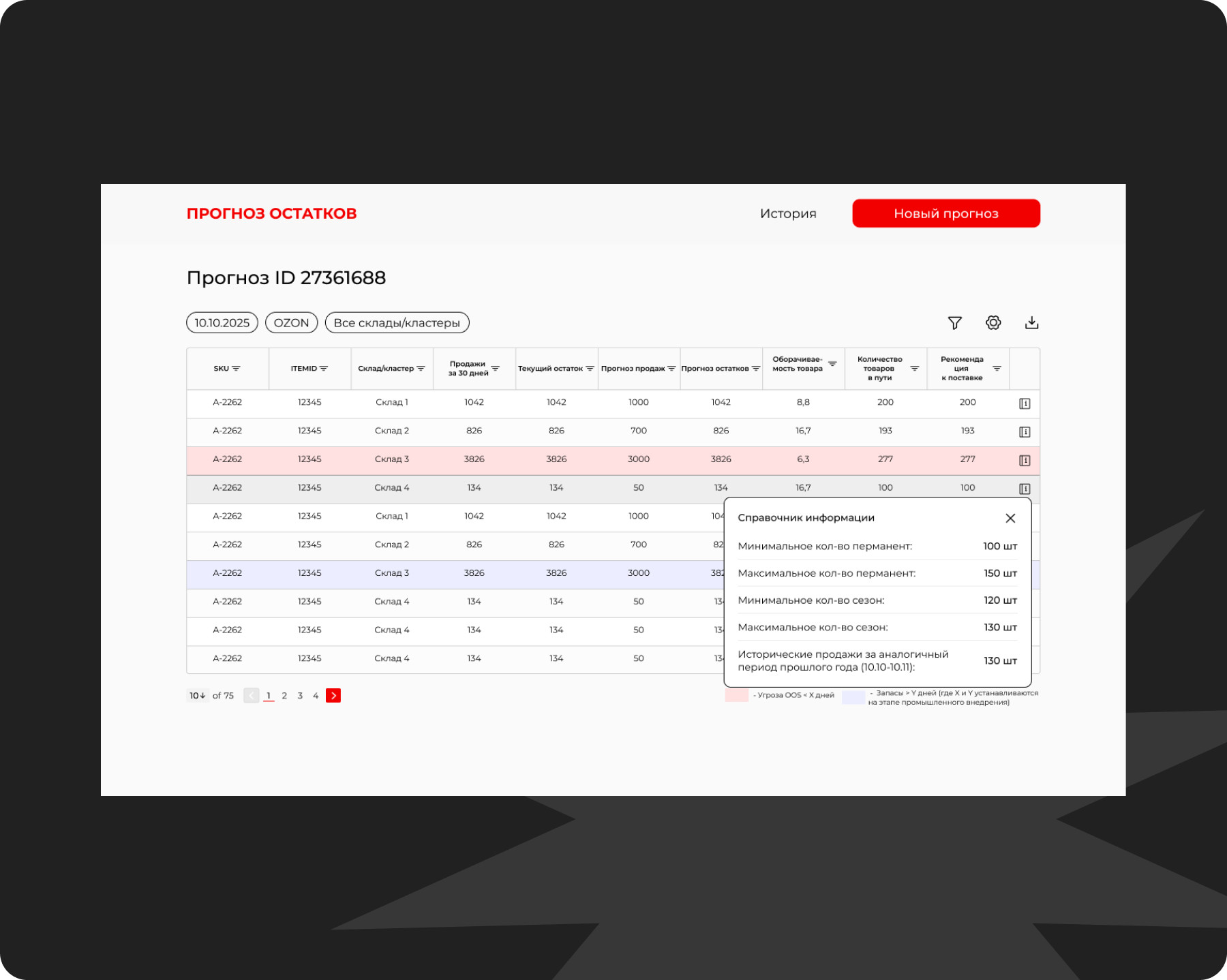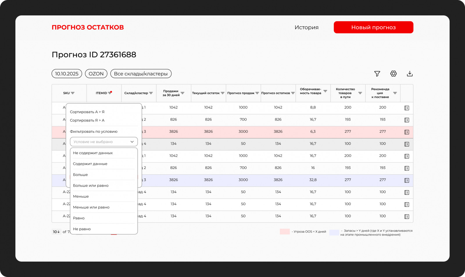 - Автоматизировать пороги срабатывания алертов. Подсветка и/или сигнализация угрозы OOS (Out Of Stock) и перетаривания склада.