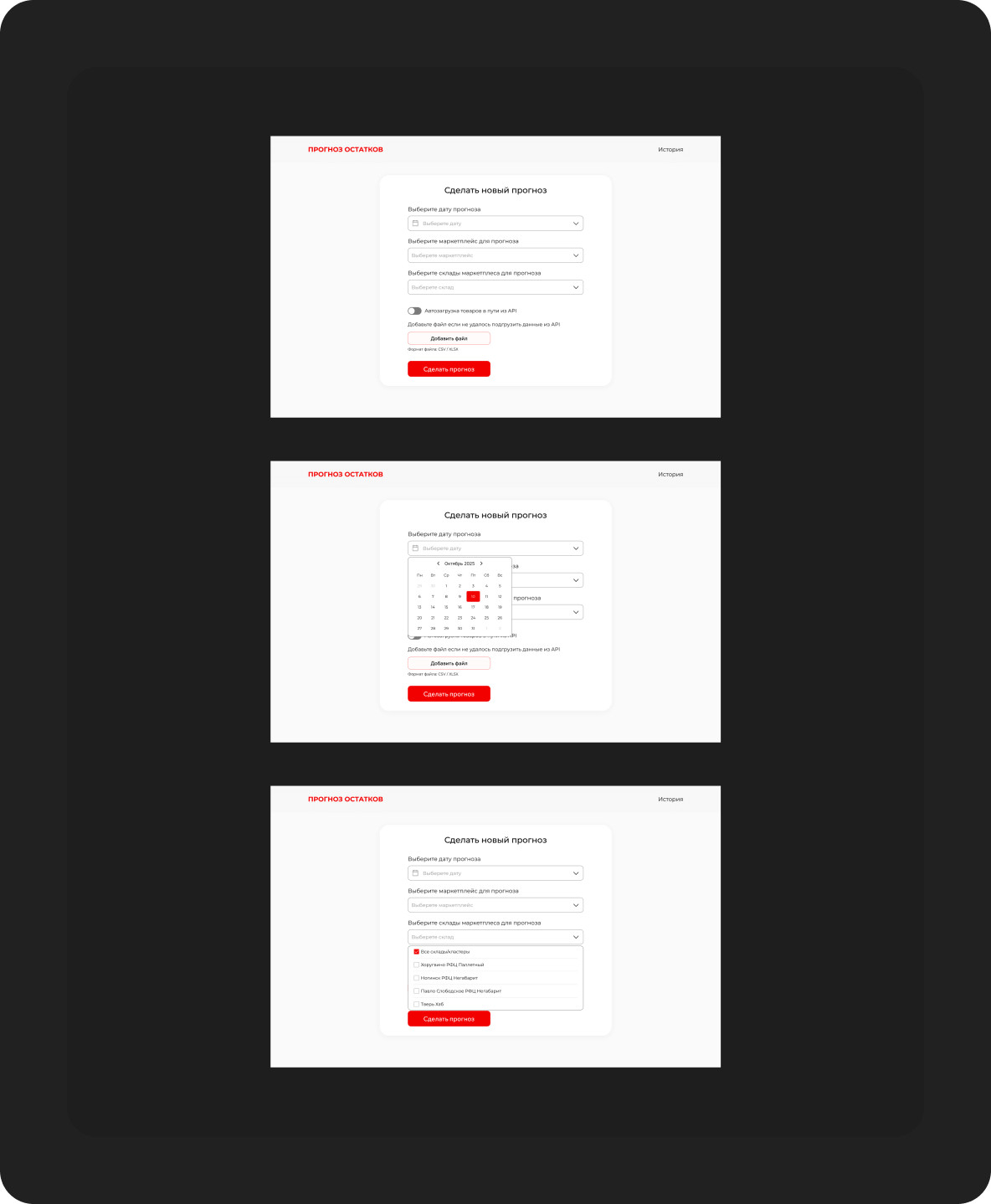 Клиент вводит ручные корректировки (период прогноза, маркетплейс, кластер/регион поставки и количество товаров в пути). После нажатия кнопки «СДЕЛАТЬ ПРОГНОЗ» система рассчитывает прогноз поставок.