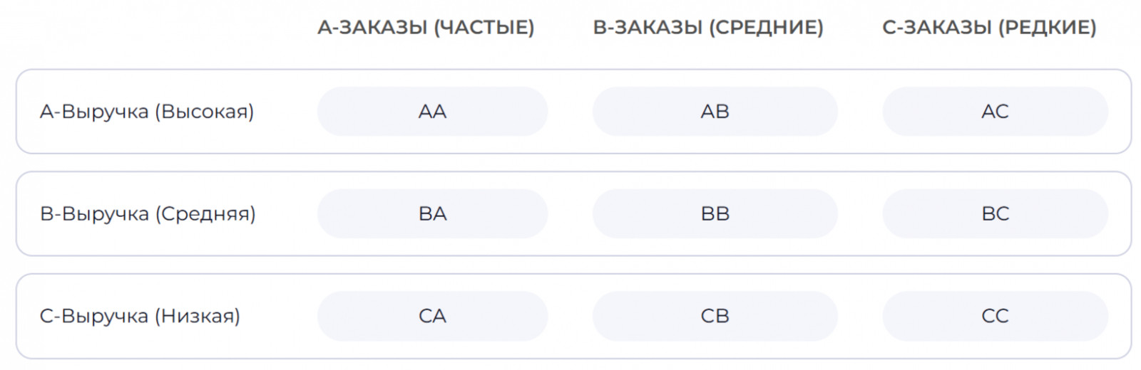 Мы создали матрицу, где по вертикали — категория по Выручке (A, B, C), а по горизонтали — категория по Заказам (A, B, C). В результате получилось 9 групп. Каждый товар получил двухбуквенный код в зависимости от своих позиций в двух анализах. Например, товар с высокой выручкой (A), но средним количеством заказов (B) попадает в категорию AB. Критерии и интерпретация категорий товаров