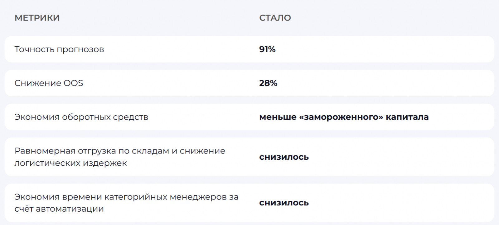 Это гарантировало, что система готова к промышленному внедрению и способна сформировать надежные прогнозы на срок до 1 года, который, в свою очередь, строится на основании прогноза продаж и спроса.