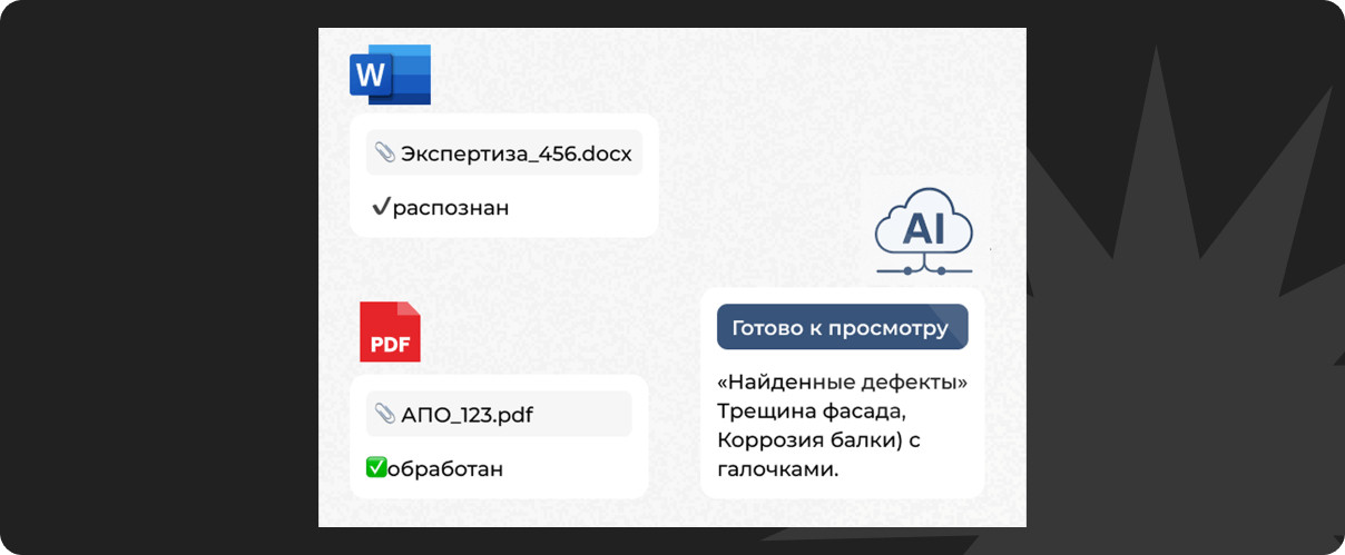 Мы внедрили ИИ-агента, который берёт на себя полный цикл обработки АПО и экспертиз девелопера. Агент распознаёт загруженные документы (Word и сканы), приводит данные к единому формату и автоматически классифицирует дефекты и виды работ по справочникам.