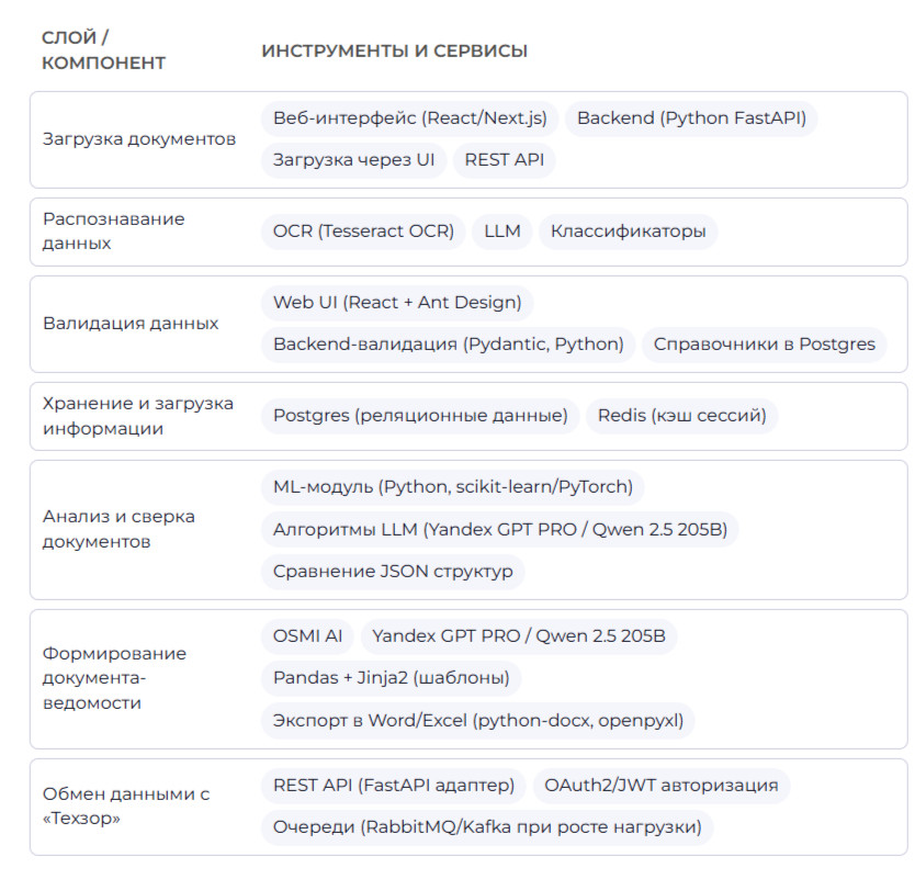 - Сократить время обработки документа. Уйти от ручной работы к ИИ-агенту для распознавания Word-файлов/сканов, автоклассификации, сравнения, расчёта стоимостей, формирования ведомостей.