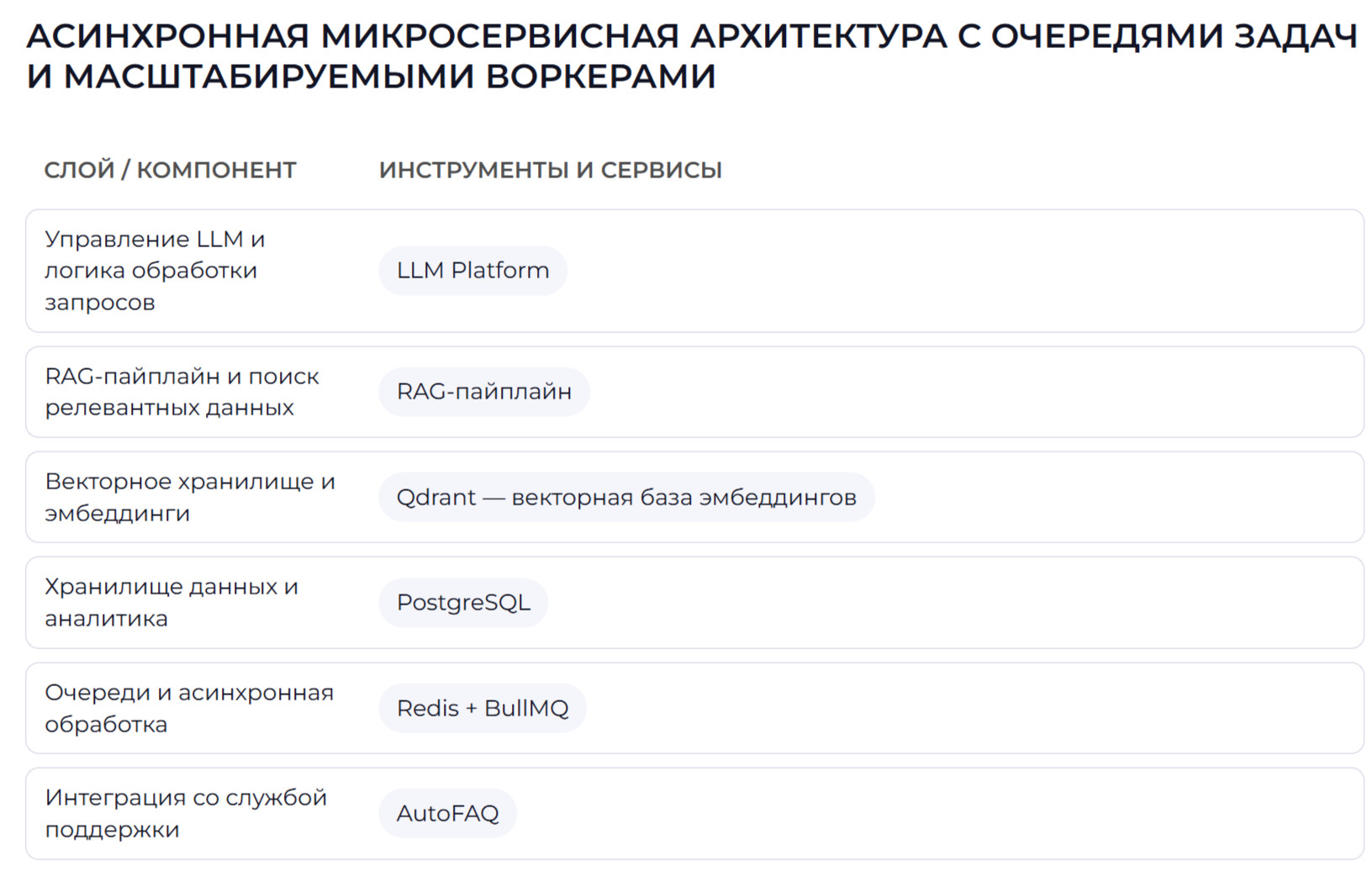 Спроектировали и внедрили асинхронную микросервисную архитектуру с очередями задач и масштабируемыми воркерами, развернули компоненты LLM Platform, RAG-пайплайн, Qdrant (векторная база), PostgreSQL (диалоги и аналитика), Redis + BullMQ (асинхронная обработка) и интеграцию с AutoFAQ.