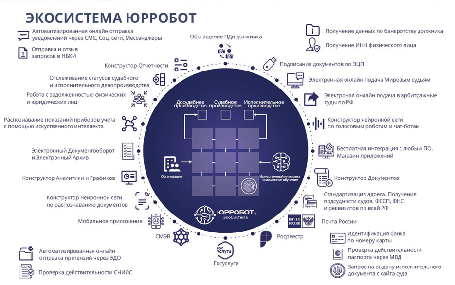 С помощью машинного обучения и искусственного интеллекта ЮРРОБОТ гиперавтоматизирует весь цикл работы с должником — от автоматического роботизированного обзвона, расчетов пени, госпошлины, определения подсудности, реквизитов суда и формирования электронного документооборота претензионно-исковой деятельности и до отправки документов в суд онлайн, используя электронно-цифровую подпись (ЭЦП), формирования вынесенного судебного решения для мирового судьи, исполнительного листа, запроса в ФНС/банки для судебных приставов. Платформу можно использовать на ПК с любой операционной системой, а также на планшетах и смартфонах.