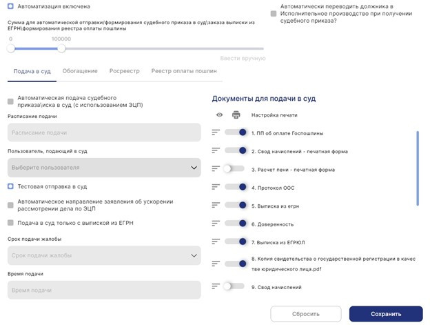 Модуль автоматизации автоматически заказывает выписки из ЕГРН, обогащает данные, формирует и подготавливает реестры оплаты пошлины, ЗВСП, иски, проекты судебных приказов, отправляет в суды в онлайн режиме подписывая по ЭЦП, автоматически распознает и формирует необходимые документы по должникам на основе искусственного интеллекта.