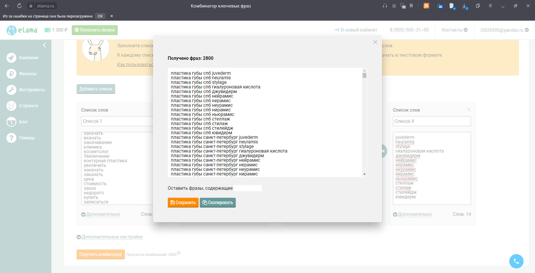 Пример работы с сервисом «Комбинатор фраз от Elama»: