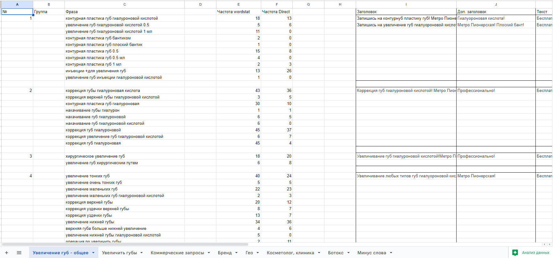Пересобрали базис. Основная идея сбора базиса была в том, чтобы проработать вложенные запросы. Для контурной пластики используются определенные препараты и запросы, содержащие названия препаратов, более горячие, ведь клиент уже знает, какой филлер ему нужен, и ищет услуги именно с этим препаратом.