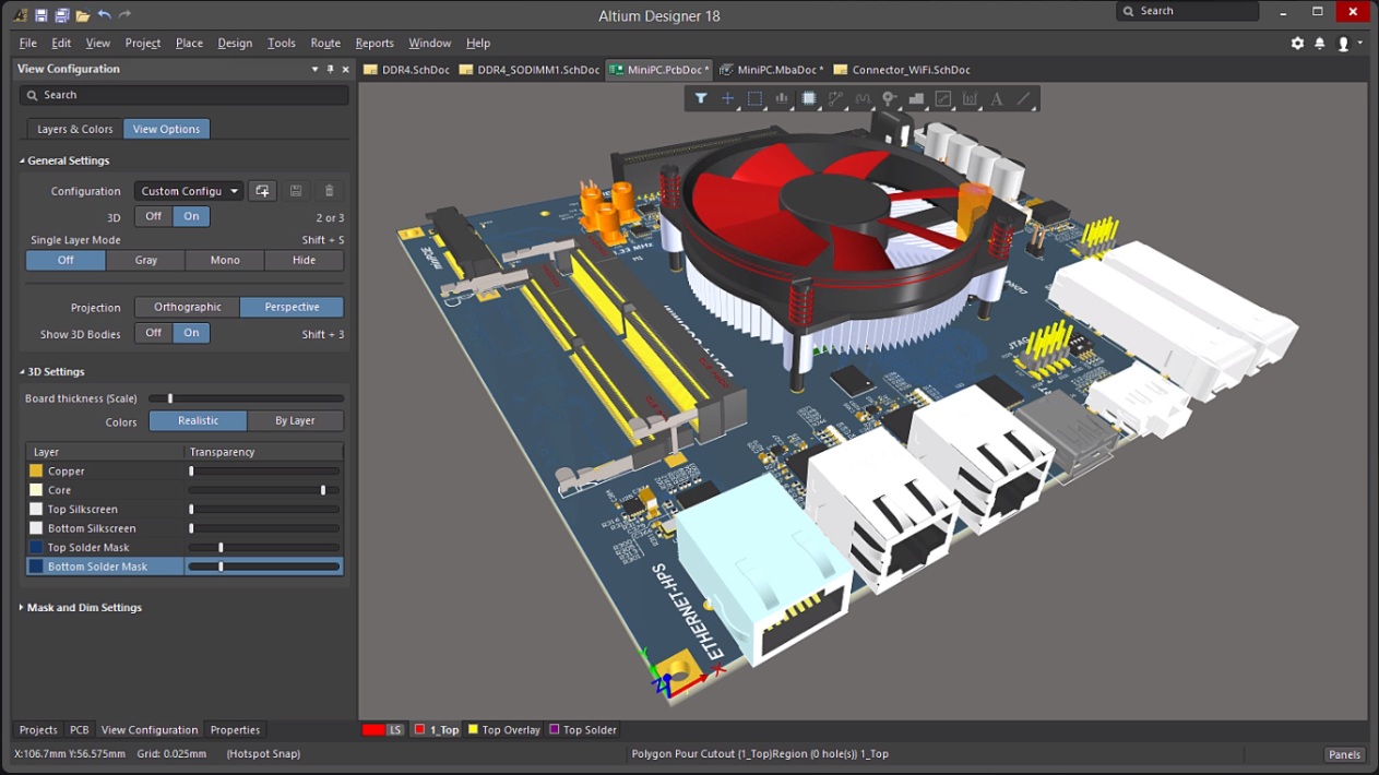 Также стоит отметить поддержку 3D-моделирования в Altium Designer. Проектировщики могут просматривать свои печатные платы в трехмерном пространстве, что позволяет визуализировать компоновку компонентов и проверять возможные проблемы с установкой до изготовления платы. Это значительно снижает риски и потенциальные проблемы при производстве.