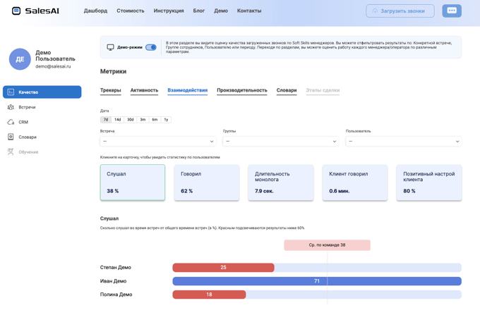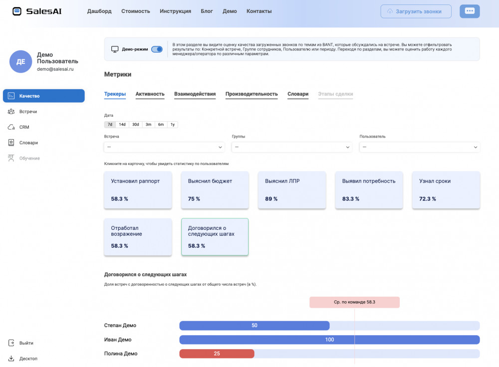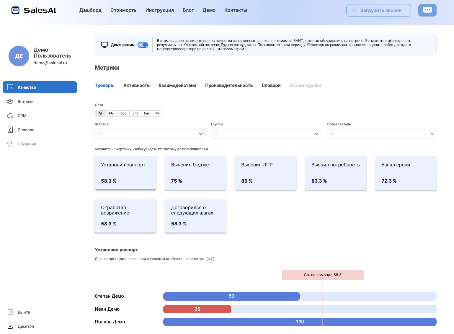Сейчас нейросеть SalesAI автоматически извлекает из диалогов с клиентами ответы на 10 вопросов, записывает ответы на каждый из них в 10 разных ячеек CRM клиента, автоматически создает КП после звонка и контролирует качество работы менеджеров по продажам по 15 параметрам. Это дает большой компании с командой 50+ менеджеров мощный рычаг конкурентоспособности и увеличения выручки. За первые 2,5 месяца мы помогли нашему клиенту улучшить следующие цифры: За следующие 2 месяца мы увидели еще прогресс: Тоже хотите взять под контроль все звонки и управлять конверсией? Бронируйте Демо встречу>