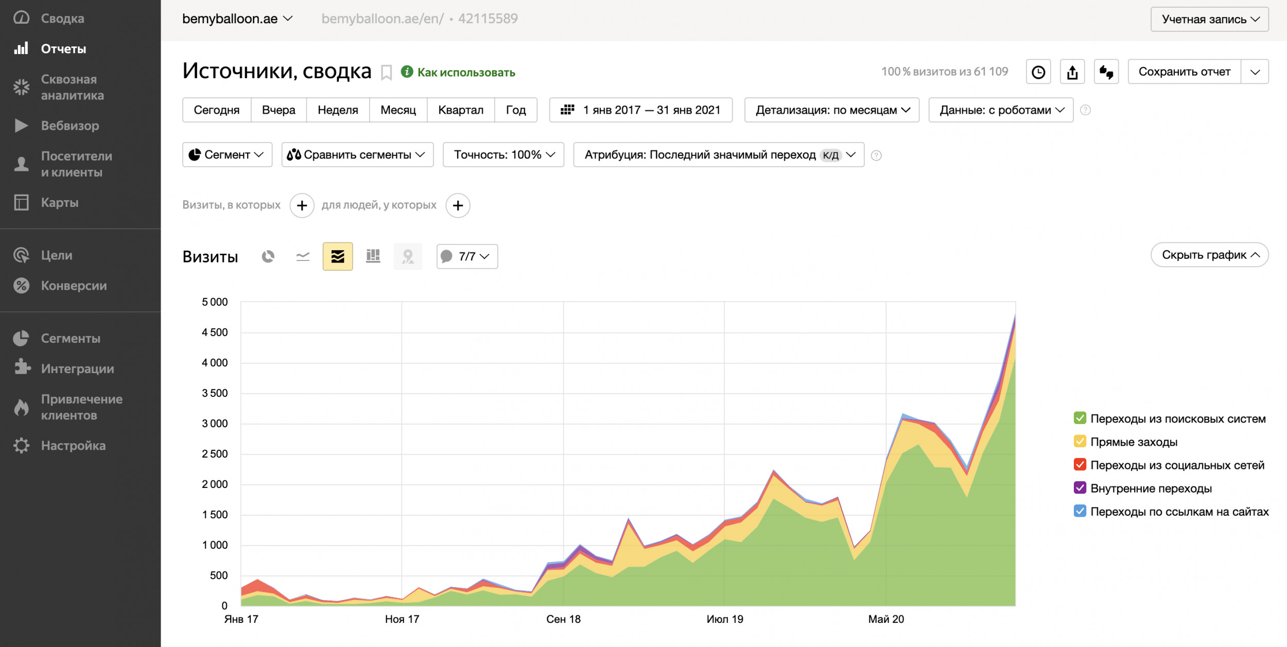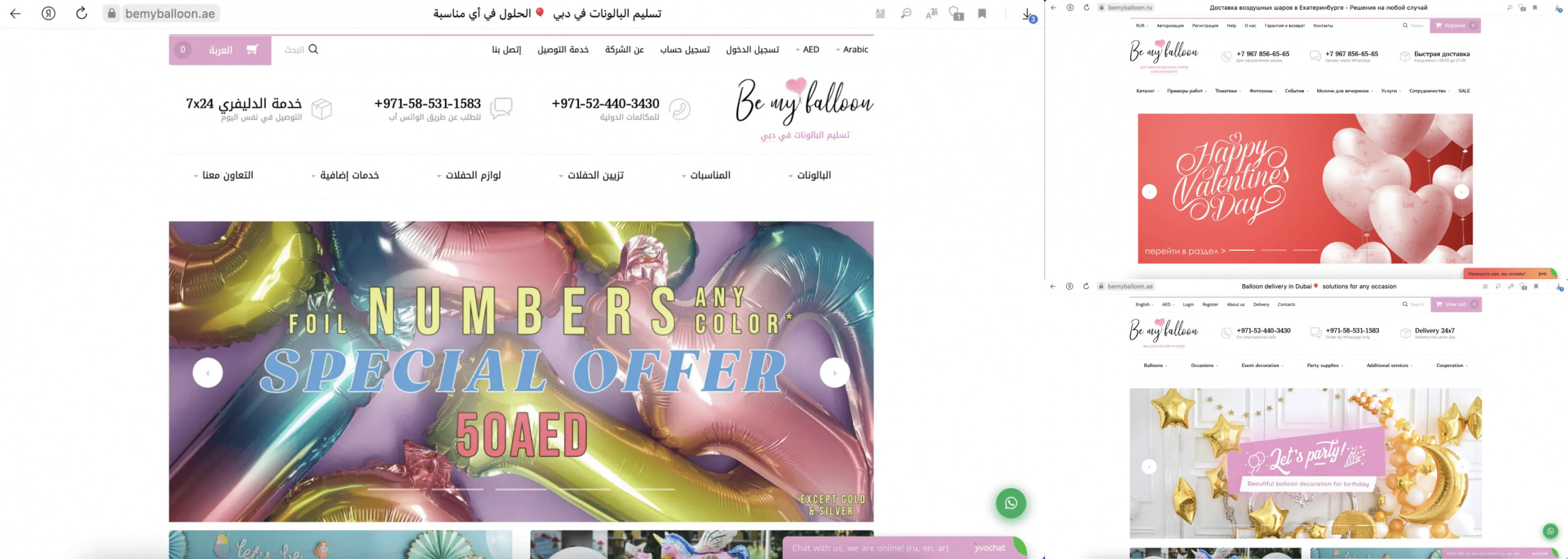 Мы продолжали развивать комплексный маркетинг, ходили на встречи, изучали местный рынок, но события развивались медленно. Спустя несколько месяцев поняли — настало время плана Б. Пункт первый: не унывать. Пункт второй: попробовать зайти с другой стороны и развить направление, не связанное с айти. Ответ нашелся случайно: как-то мы вышли во двор нашей виллы и увидели шарики, оставленные соседями. Вспомнили, что у Сергея несколько лет назад был бизнес по продаже шаров в Екатеринбурге. Стало интересно, а как с этим в эмиратах? После нишевого экспресс-ресерча в Instagram* мы создали аккаунт магазина шариков. Нарисовали лого «на коленке», загрузили в ленту пару фото с Pinterest и без продвижения получили заказ на следующий день. Поняли, что надо раскачивать соцсети. По классике 2017 года: Пока заказов становилось больше, срок действия визы истекал. Чтобы не бросать перспективное начатое, решили вести аккаунт и прокачивать маркетинг удаленно, а новые заказы перенаправлять на конкурентов за процент. Когда мы приехали в Россию, поняли, что нам нужен свой сайт-витрина. Если вы были за границей, то знаете, как неудобно заказывать доставку цветов, шаров и других подарков через кривые сайты-агрегаторы. Мы сделали интернет-магазин с продуманной логикой и дизайном и сразу вылетели в топ в Google благодаря качеству и проработанному SEO. В первую очередь мы: Bemyballoon стала лидером и почти единственной компаний в нише, которая показывает ассортимент в наличии, цены и реальные сроки доставки. В 2018 году в регионе ОАЭ с digital была беда. Многие сайты выглядели как кривой лендинг с растянутыми фото из интернета, заголовком: «У нас есть шарики, звоните, скинем каталог в Вотсапе», и дисклеймером: «Реальный продукт может не соответствовать картинке». Мы же запарились и сделали все для пользователей: Кстати, 2/3 решений оказались не самыми удачными. Об этом подробно расскажем в следующем кейсе о ребрендинге, маркетинговой стратегии и новом сайте Bemyballoon. Таргет, реклама в Google, SEO-продвижение — благодаря работе этих каналов клиентов стало очень много. КМС (контекстно-медийную рекламу) мы отключили почти сразу — переходов было достаточно, лидов — не очень. Без факапов тоже не обошлось: как-то контекстолог сделал рекламные объявления с девушками и шампанским. На тот момент мы не до конца понимали, насколько мусульманский регион строг к визуалам. Конечно, рекламную компанию заблокировали. Еще был случай, когда мы старгетировались не на ту аудиторию. На баннер с девушкой и шариками толпами стали реагировать иностранцы с предложением познакомиться. Решение полноценно вложиться в маркетинг на старте было верным, объемы росли быстро. Мы почувствовали, что нет смысла отдавать всё конкурентам. Поэтому, спустя год удаленной работы, мы решили вернуться и достроить бизнес. Как только Сергей приехал в эмираты, купил нужное оборудование и закинул его в багажник. Сам жил в гостинице, а когда прилетал заказ, шел на парковку, надувал шары и отвозил клиентам. _________ Как-то в 11 вечера ко мне подъехала полиция. Конечно, именно в этот раз я надувал шарики с матерными фразами на английском. Подошли двое полицейских, посветили фонариком внутрь салона. «Вы что, живете в машине?!». «Нет-нет, у меня тут шарики, я друзьям надуваю». Больше они ничего не спросили, только пожелали быть аккуратнее на дороге: ) Сергей 