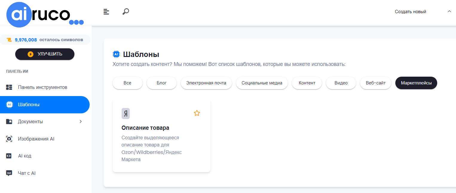 Существует несколько методов для генерации описаний продуктов с помощью нейросетей. Один из них — это использование уже готовых шаблонов в нейросетях типа Airuco. Здесь есть уже готовый шаблон «Описание товара».