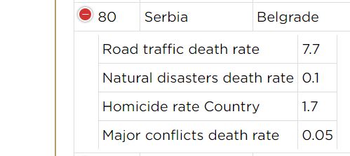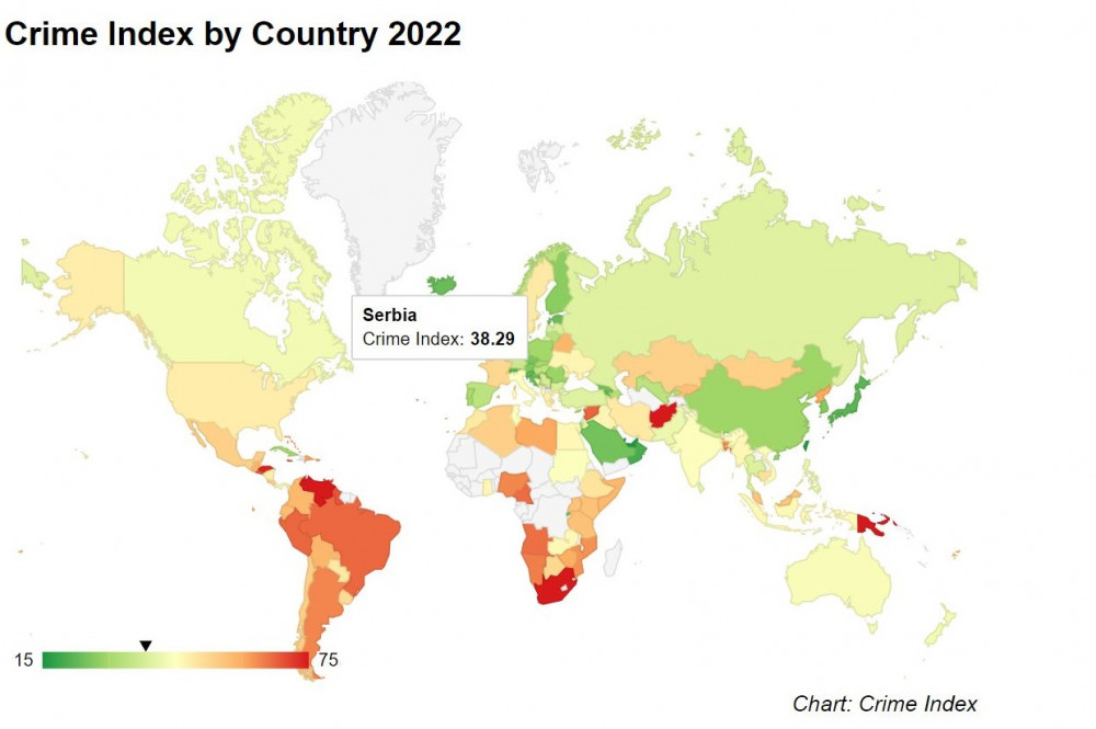 Согласно этим данным, Сербия занимает 45-е место из 142 исследуемых стран, ее индекс криминала равен 38,3 балла, а индекс безопасности 61,7.