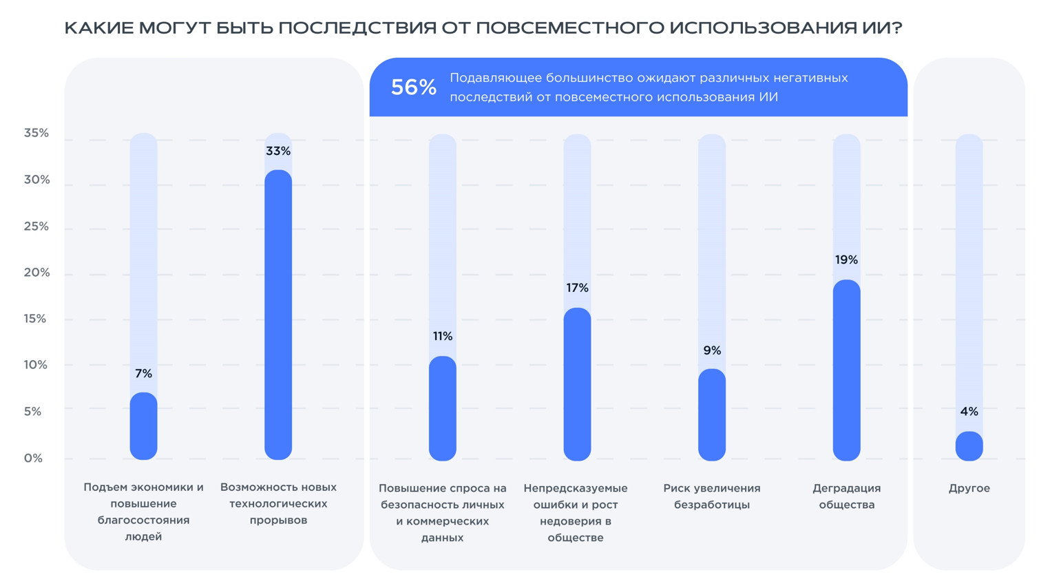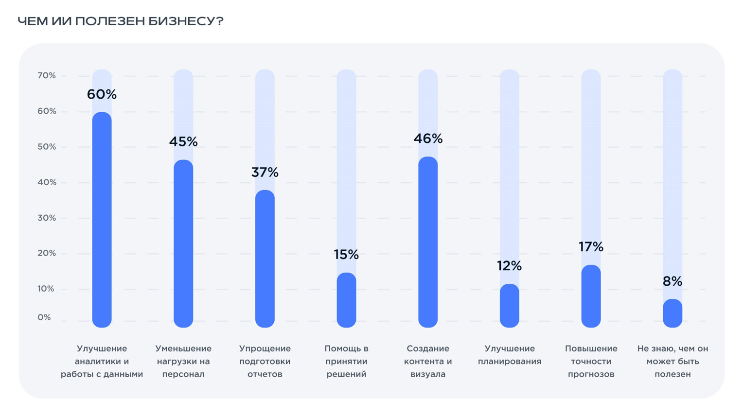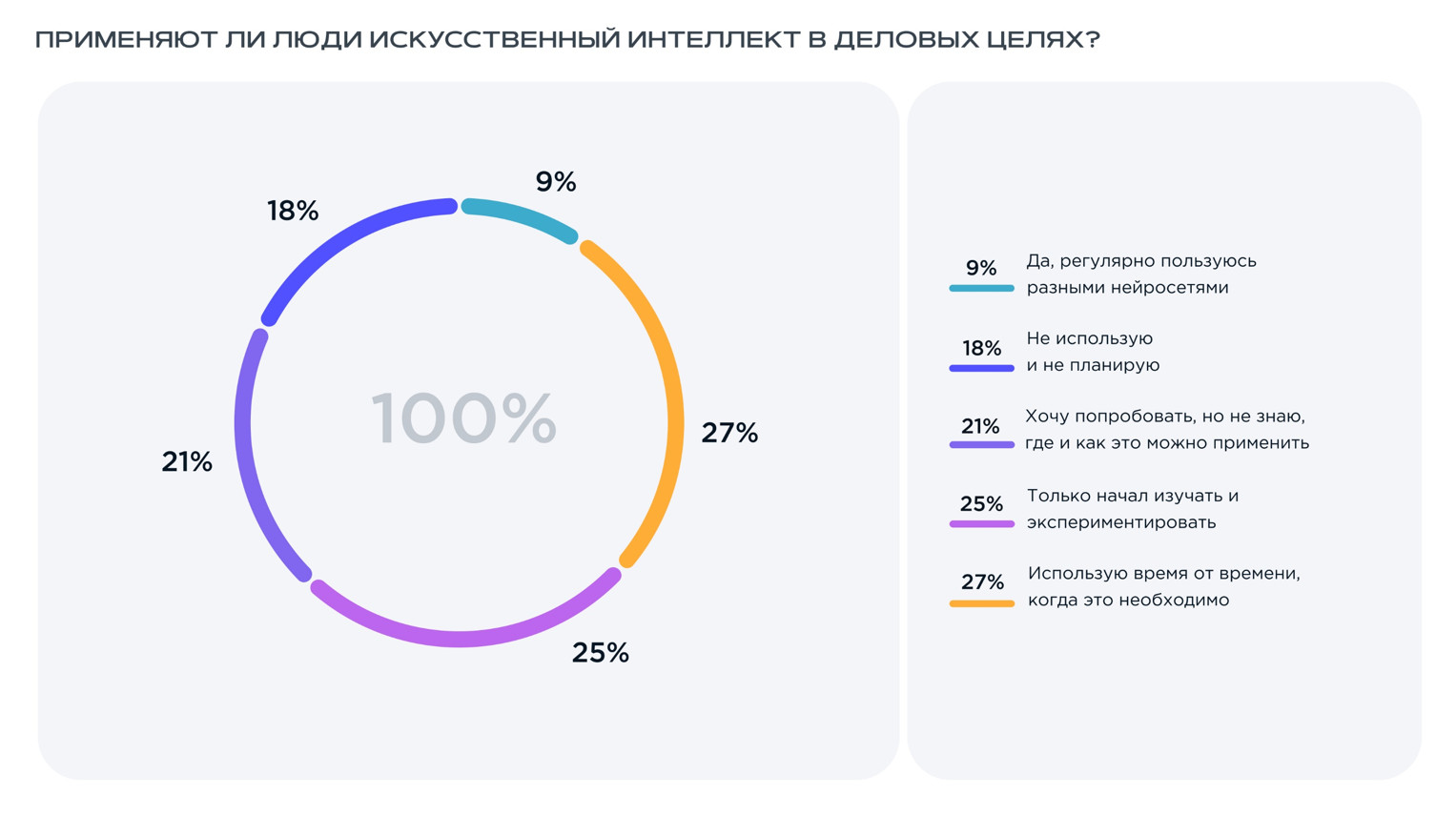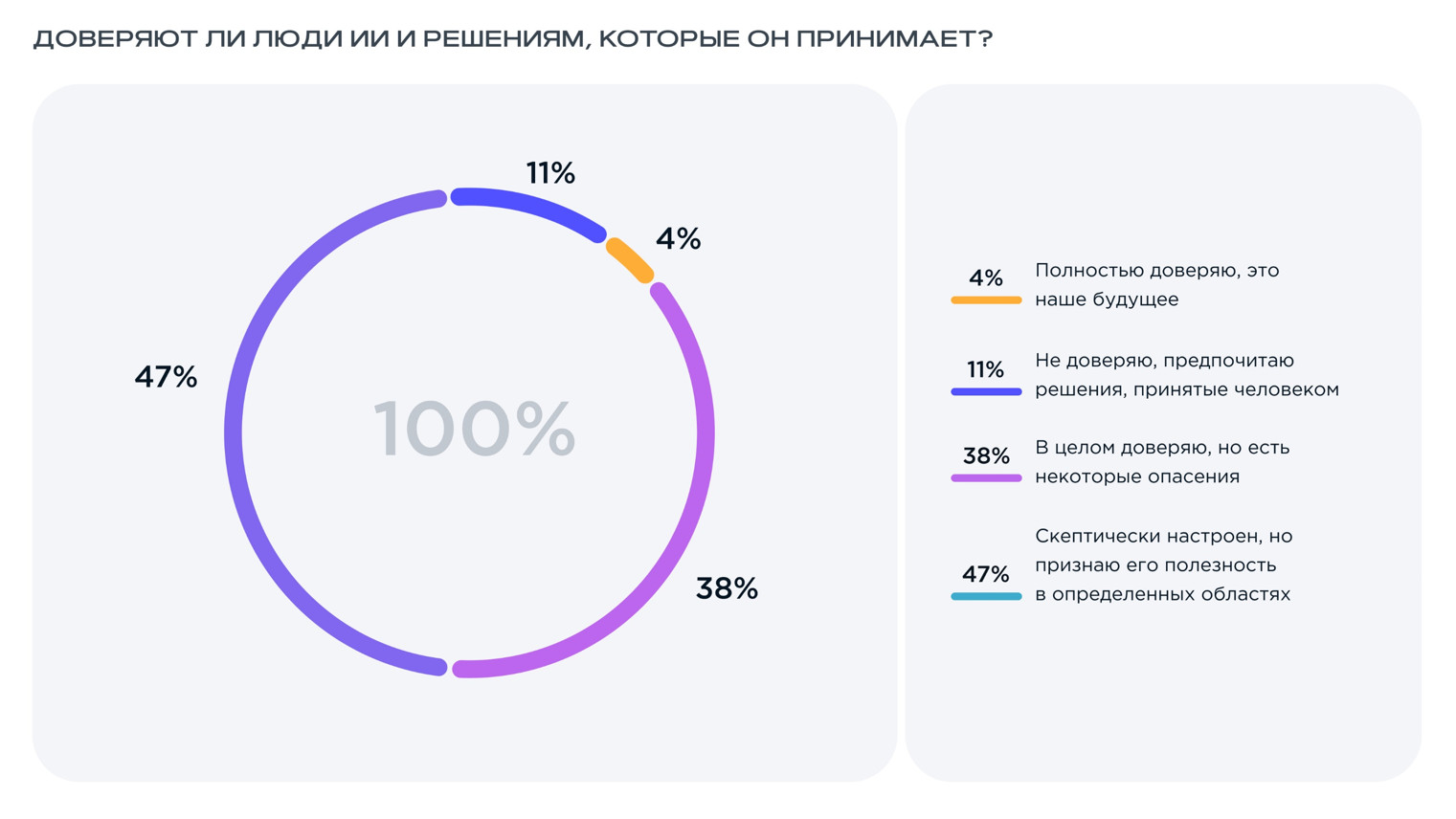 Мероприятие проходило при поддержке искусственного интеллекта, который вместе с Екатериной Здесенковой, СЕО и управляющим акционером iConText Group, выступал в роли ведущего этого бизнес-события. За плечами — жаркие дискуссии, полезные доклады, обсуждение острых вопросов, неформальное общение и кофе-брейки. Эксперты обсудили, как нейросети и продвинутые ИИ-алгоритмы повышают эффективность, оптимизируют процессы и какие открывают новые возможности для бизнеса. В рамках мероприятия поднимались такие вопросы, как влияние развития ИИ на рынок труда, этика и безопасность использования ИИ, роль ИИ в дизайне, юридические аспекты ИИ, а также лучшие бизнес-практики в сфере AI-технологий. Как все прошло, что было интересного и какие новые знания получили участники мероприятия, читайте в нашем обзоре. На конференции iConText Group, icontext и Up&Wise представили исследование «Искусственный интеллект: эффективный инструмент или модное явление». Юлия Шелыгина, директор по маркетинговым коммуникациям iConText Group и СЕО Up&Wise: В рамках исследования мы опросили 3000 респондентов и узнали их мнение о развитии ИИ-технологий и их интеграции в бизнес. Респонденты — женщины и мужчины, работающие как в коммерческом, так и в государственном секторе, в разных отраслях и занимающие разные должности. В опросе участвовали руководители разных уровней, собственники бизнеса, специалисты, ведущие специалисты, фрилансеры и самозанятые. Отдельно хочу отметить, что ИИ выступал не только предметом исследования, но и его непосредственным участником, соавтором. На разных этапах работы над проектом мы привлекали нейросети и наблюдали, как они решают задачи. В рамках презентации исследования были представлены интересные данные. Например, несмотря на то, что 61% опрошенных уже используют ИИ в работе, на постоянной основе это делают только 9%. 18% вообще не планируют применять ИИ. Еще 21% хотели бы использовать ИИ, но не понимают, какую пользу это может принести. Какой вывод можно сделать? При этом на вопрос, чем ИИ может быть полезен бизнесу, 60% респондентов ответили, что его основное преимущество заключается в улучшении аналитики и обработке данных. Также большую роль ИИ играет в создании контента и визуала (46%), уменьшении нагрузки на персонал (45%) и упрощении подготовки отчетов (37%). При этом 15% выражают надежду на то, что ИИ поможет им в принятии решений*. *В этом вопросе у респондентов была возможность выбрать сразу несколько вариантов ответа. В каждом варианте за 100% взяли общее количество людей, прошедших опрос. Среди наиболее значимых проблем при использовании ИИ в бизнесе люди чаще выделяют безопасность личных и коммерческих данных, нехватку специалистов и риск увеличения безработицы (в этом вопросе респонденты также могли выбрать несколько вариантов ответа). Говоря о применении искусственного интеллекта в повседневной жизни, 47% респондентов уже имеют дома одно или более умных устройств. Из них 12% называют себя активными пользователями. При этом 34% опрошенных вообще не видят ценности применения ИИ в быту. Из них 4% не хотят использовать его из соображений безопасности. Самый интересный сегмент для производителей умных устройств — люди, которые еще не пробовали их применять, но планируют в ближайшее время (их 19%). В рамках опроса у людей также спросили о последствиях, которые могут возни