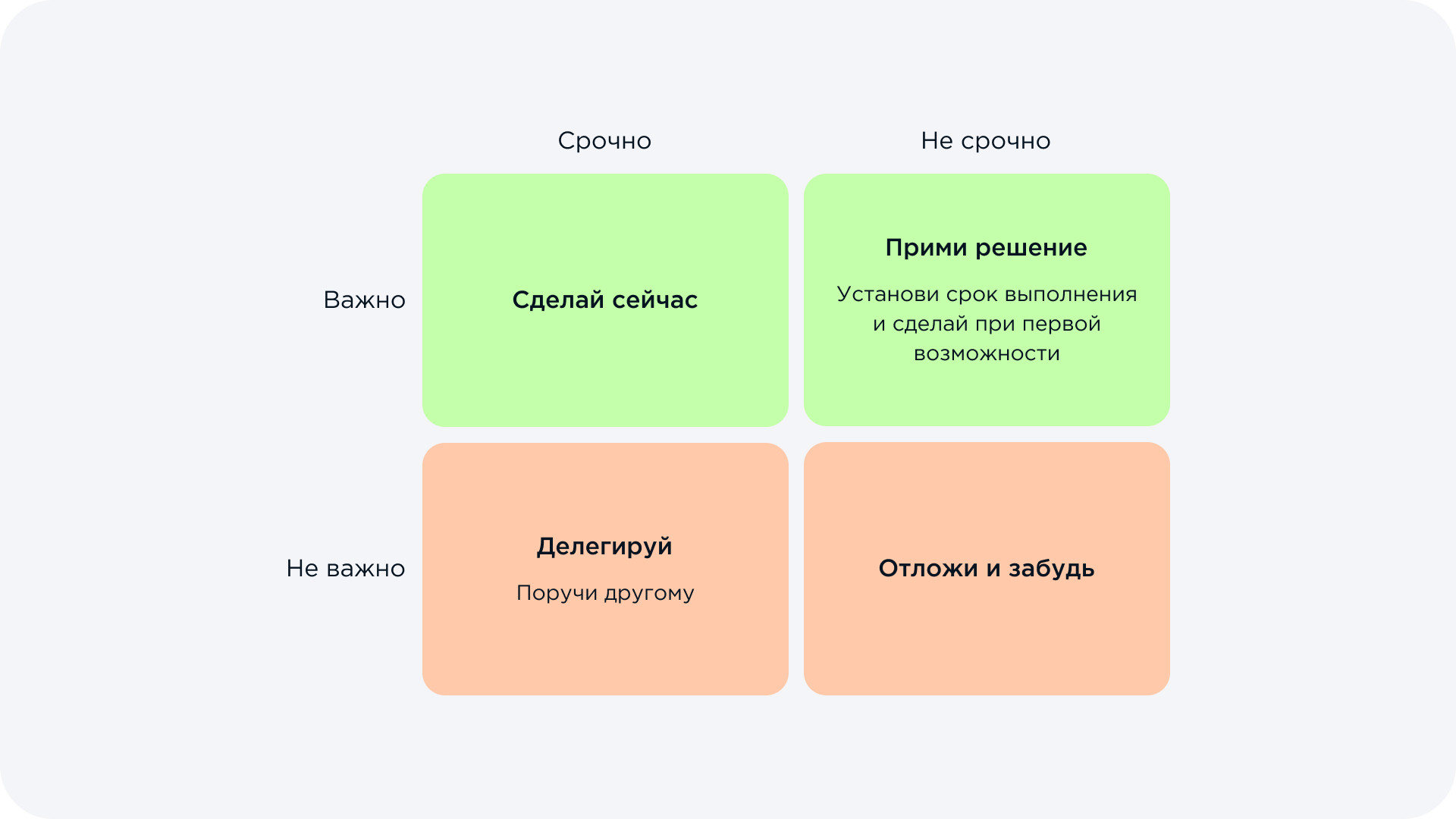 Кстати, в пользу этого метода говорит и кривая забывания Эбингауза: вы максимально сфокусированы и помните обо всём, что происходило в течение дня. Иначе воспринимаете структуру задач и больше в них погружены. Уже на следующее утро вы помните не более 35%, а через выходные — 1-2 дня — забываете, что вообще делали. Каждый раз, пытаясь восстановить в памяти всё, что было и что нужно выполнить, стрессуете. Для фиксирования подходят любые трекеры задач: Битрикс, Asana, Jira и другие. Мне удобнее вести трекинг в Excel или Google-таблицах, раскладывая задачи на год, месяц, неделю и день. Со стороны подход может показаться безумием, но через две-три недели приносит первые результаты. Особенное удовольствие он доставляет, когда после долгих новогодних, отпуска или других праздников жизни, в отличие от большинства, вы можете быстро войти в рабочий режим (у меня это именно так). Еще один пункт, на котором вы теряете время, силы и выгораете. Для начала освежим бэкграунд любого тайм-менеджера — приоритизацию и выполнение задач по матрице Эйзенхауэра.Согласно этой матрице, все задачи можно приоритизировать по двум метрикам: важность и срочность. Также есть эмоциональный критерий приоритизации дел внутри блоков. Находясь в потоке задач, которые вы уже учли и обозначили для себя, важно помнить, что САМОЕ ГЛАВНОЕ. Выполняйте задачи строго в порядке приоритетности. Кстати, если вы руководитель — фокус вашего внимания и личные усилия в большей степени должны быть сосредоточены на поле «Важно, но не срочно». Остальное, по возможности, нужно делегировать. Если вам слишком часто приходится работать над другими полями «вручную», стоит пересмотреть подходы к выстраиванию внутренних процессов и работе с командой (если она, конечно, есть). Именно в этом пункте стоит отметить, что нельзя себя перегружать. Не пытайтесь выполнить задач больше, чем можете потянуть. Это касается и работы, и всех аспектов личной жизни. Оцените, все ли задачи, которыми вы себя нагрузили, так важны. Я знаю человека, который на полном серьезе каждый раз создает список задач сверхчеловека: он вносит в него занятия в зале и йогу, обязательное чтение книг и очень ругает себя, что постоянно не выполняет эти пункты. Разумеется, в такой нагрузке они просто не приоритетны и не соответствуют его возможностям. Призываю не вносить в список задач бег и походы в спортзал, если вы не хотите этого делать или не можете по объективным причинам: замените их. Например, более приятной нагрузкой — долгой пешей прогулкой. А чтение книги ради факта чтения книги замените на просмотр интересного документального кино, если вам это подходит. А по рабочим задачам — отследите норматив своей нагрузки и эффективность. Старайтесь улучшать показатели и экспериментировать, но не до фанатизма. «Когда же экспериментировать, если я и так ничего не успеваю?», — спросите вы. А это уже вопрос приоритетов, поэтому возвращаемся к предыдущему пункту и смотрим, какие задачи важные и срочные, какие можно делегировать, а от каких — отказаться. Не надо жалеть себя перед выполнением каждой большой задачи — на это банально уходит слишком много времени. Не надо бояться и откладывать задачу, потому что она кажется большой и сложной. Это пункт о внутреннем стержне, который есть в каждом. Старайтесь сместить фокус от неприязни к задаче из-за ее ве