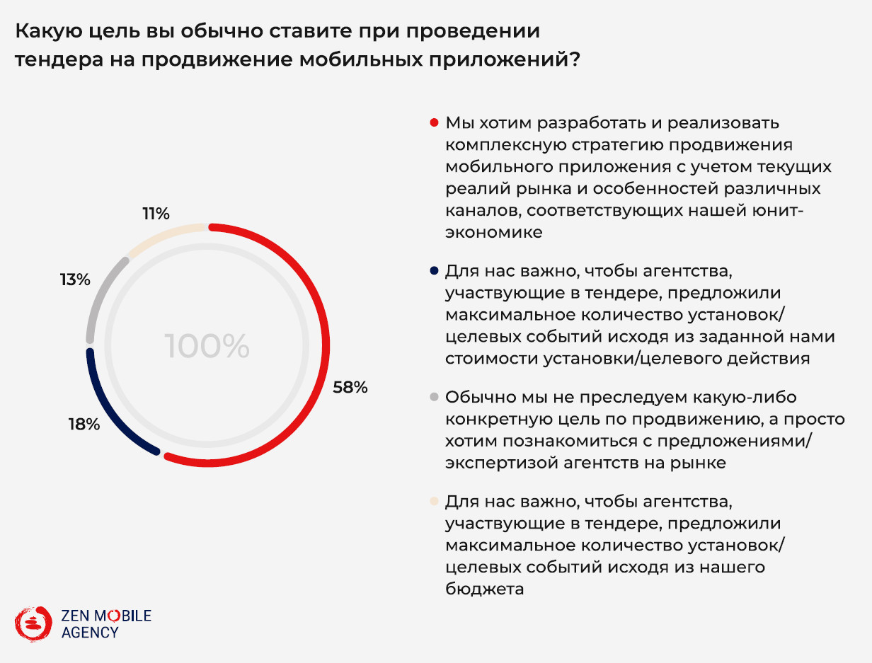 Елена Пикунова, основатель и генеральный директор Zen Mobile Agency, представила эксклюзивные данные исследования тендерного участия. В числе респондентов — 57 рекламодателей и 9 агентств-участников. Это рекламные агентства сегмента продвижения приложений, по данным AdIndex 2023 и интерактивной карты рынка Mobile In-App 2023 от АРИР. Мы выделили ключевые поинты этого исследований и делимся ими с вами. Если в прошлом году менее 55% клиентов проводили мобильные тендеры, то в этом году их 67%. За год общее количество тендеров увеличилось в 1,5 раза.Но несмотря на использование детерминированного подхода при формировании выборки, в опросе также удалось задействовать 33% респондентов, не проводивших мобильные тендеры. В чем причины отказа от проведения тендера: Причины отказа могут быть связаны со сложностями в процедуре проведения тендера для рекламодателя, отсутствием с его стороны достаточной квалификации и опыта, финансовыми ограничениями. Еще одна причина — агентства часто предлагают шаблонные подходы. Эта проблема особенно остро стоит в условиях сокращения доступного рекламного инвентаря в России в 2024 году. Большинство респондентов (58%) в качестве цели проведения тендеров указывают разработку и реализацию комплексной стратегии мобильного продвижения. 18% ждут предложений по максимальному объему установок или целевых событий по заданной ими стоимости. 11% ориентируются на свой бюджет и рассчитывают на предложения по максимальному объему установок или целевых событий в рамках заданного бюджета. Оставшиеся 13% опрошенных заявляют об отсутствии конкретной цели — такие рекламодатели проводят тендеры для знакомства с экспертизой агентств на рынке. Со стороны глубинного опроса можно выделить следующие мнения рекламодателей о целях проведения тендеров: Несмотря на то, что самый большой процент ответов говорит о важности стратегии, на рынке все больше тендеров на ценовые и количественные показатели. По результатам опроса, лишь 21% рекламодателей предоставляют полную информацию о своем приложении, включая данные о воронке и конверсии для органического и платного трафика; 74% респондентов предоставляют информацию частично; 5% вообще не раскрывают сведения. Что касается доступа к системам мобильной аналитики для подготовки тендерного предложения, большинство респондентов также его не предоставляют — среди всех опрошенных таких оказалось 55%. 24% ссылаются на конфиденциальность и соответствующие ограничения. И только 18% готовы делиться доступами для точного планирования. Оставшиеся 3% выгружают основные данные по воронкам. Однако эксперты отмечают, что для подготовки тендерного предложения и эффективного медиапланирования рекламодателям рекомендуется обеспечивать доступ к системе мобильной аналитики или предоставлять достаточное количество данных.Полагаться исключительно на рыночную экспертизу агентства нецелесообразно: ее может быть недостаточно для данной вертикали или она может быть общей и не учитывать индивидуальные особенности и потребности конкретного приложения. В рамках исследования эксперты Zen Mobile Agency также опросили 9 рекламных агентств-исполнителей и узнали, какие преимущества и недостатки участия в тендерах они выделяют. Плюсы участия в тендерах: Минусы участия в тендерах: Кроме того, агентства рассказали о странных тре