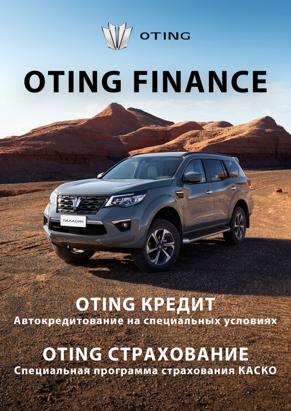Сейчас кредитная программа «OTING ФИНАНС» распространяется на модель «Паладин», который, благодаря своим техническим характеристикам и внедорожным качествам, по праву является покорителем бездорожья: «Паладин» — рамный внедорожник с многорычажной подвеской спереди и независимым мостом сзади, а также увеличенным дорожным просветом в 215 мм и мощным двухлитровым мотором с турбонаддувом (228 л.с., 360 Нм). Благодаря жестко подключаемому полному приводу и колесной базе более 2,8 метров, этот внедорожник обладает всеми необходимым качествами для самых требовательных путешественников.