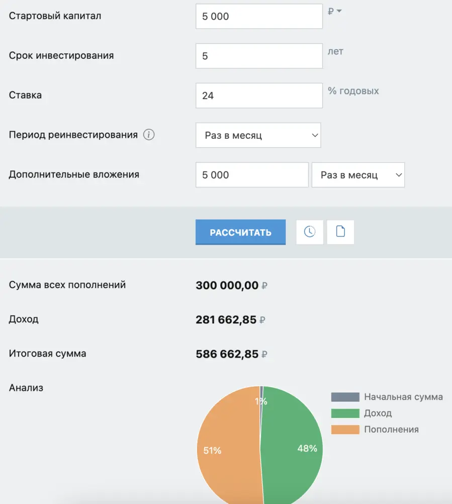 А теперь смотрим в долгосрочной перспективе. Если вы вкладываете пять тысяч рублей ежемесячно, то к концу года у вас на счету накопится 60 000 рублей, а еще прибавьте доходность в процентах, которая ежемесячно позволит вашей сумме увеличиваться. А уже за 5 лет ситуация кардинально поменяется. Количество вложенных средств станет равно количеству набежавших процентов, и это мы еще с вами не учитываем вложения с шабашек, наследства, продажи имущества и т.д. У всех, периодически бывают доп. поступления. Пример расчета исходя из добавления 5000р. в месяц на инвестиции Мы начинаем инвестировать с малых сумм, неизбежно приходим к крупным. А те, кто предпочитает эти 10% потратить на свои бытовые нужды, не позаботиться о себе в долгосрочной перспективе, и так и остаются в полной зависимости от своего сегодняшнего заработка. А наша с вами главная задача — перестать зависеть от текущего заработка. Правило 2. Инвестируйте столько, сколько можете потерять Любые инвестиции — это риск, и вложенные деньги можно потерять (место для комментария диванных экспертов, которые скажут, что деньги в недвижке никогда не потеряются, но у меня есть про запас пара кейсов, поэтому жду). Подвергать риску нужно ту сумму, которую вам не критично потерять. К примеру, если вы зарабатываете 100 000 рублей в месяц, и первая ваша инвестиция будет в размере 100 000 рублей, я уверен, что вы будете волноваться и постоянно проверять, что с вашими деньгами. В лучшем случае будете дергаться по этому поводу раз в день, а в худшем — утром, в обед и вечером. Знаю людей, которые обновляют данные графиков акций/крипты/валюты по 5 раз в день. Тут спойлер: если вы не профессиональный трейдер, то обновление влияет только на вашу нервную систему, на ситуации на рынке оно не отражается. Прямая зависимость количества обновлений на рост стоимости активов не доказана даже британскими учеными, а они, как известно, многое что доказали. Поэтому если хотите учиться инвестировать, то вкладывайте столько, сколько можете позволить себе потерять. Да, конечно, в любом случае будет терять деньги не приятно, но не так критично. Не гонитесь за крупными суммами, вы ведь только начинаете инвестировать. Двигайтесь в комфортном для себя темпе с теми бюджетами, которые можете себе позволить. Чуть позже сможете подобрать больше инструментов с большими капиталовложениями. Правило 3. НЕ ИНВЕСТИРУЙТЕ В ВЫСОКИЕ ДОХОДНОСТИ Когда я зарабатывал 30, 50, 100 т.р. в месяц, ловил себя на мысли, что мне просто не интересно вкладываться в продукты, которые есть на инвестиционном рынке. Ну, вложу я 100 000 рублей, через месяц я получу 1 000 или максимум 2 000р. И что? Так у меня по идее 100 000 рублей, я на них вообще-то могу и в отпуск слетать, например. А что такое 2000 рублей? Что я на них могу сделать? Один раз в магазин сходить, и то не хватит. И изучая рынок инвестирования вдруг перед глазами появляется баннер, который гласит: «Вложите деньги в нас и через три месяца у вас будет 200 000 вместо 100 000». Вот это уже действительно похоже на серьезные инвестиции, думаем мы, можно вложиться. Ну и, собственно говоря, на этом все наши инвестиции и заканчиваются. Обычно это переводы на какие-нибудь левые карты или на непонятные счета юридических лиц с мутными договорами, где ваши деньги окажутся в мифическом управлении и заработают от 100 до 500% годовых. Конечно, офер гораздо 