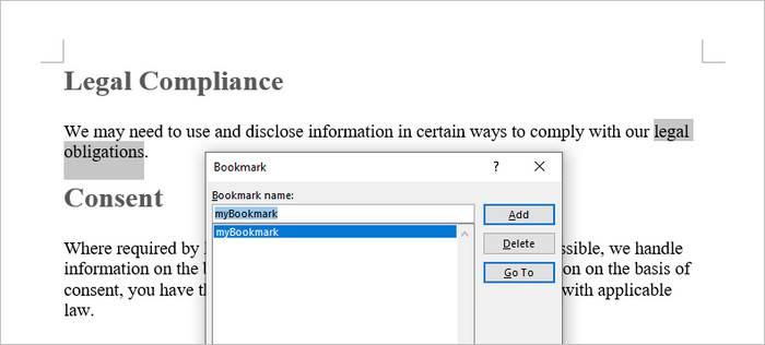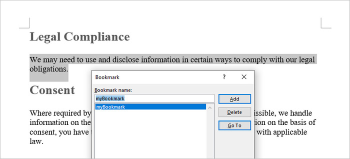 закладку к указанному тексту: from spire.doc import * from spire.doc.common import * # Создать объект документа doc = Document() # Загрузить пример файла Word doc.LoadFromFile("C:\\Users\\Administrator\\Desktop\\input.docx") # Указать строку для поиска string = «legal obligations» # Найти все вхождения строки в документе finds = doc.FindAllString(string, False,