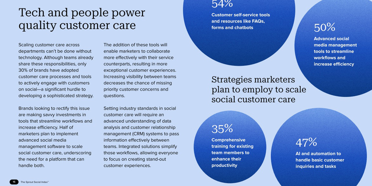 Только 30 % брендов внедряют инструменты для активного взаимодействия с потребителями в соцсетях, оптимизации процессов и повышения эффективности. Половина маркетологов планирует внедрить программы для управления соцсетями, которые позволят установить связи с другими отделами и снизить вероятность пропустить важный запрос от клиента.