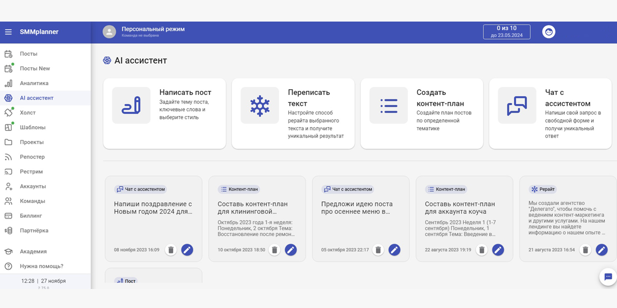 Например, один из инструментов, в котором можно создавать контент с помощью ИИ, — AI Ассистент в сервисе управления контентом SMMplanner. Мы построили его на базе текстовой нейросети ChatGPT, чтобы помогать SMM-специалистам быстро создавать экспертный контент для соцсетей. AI Ассистент может писать посты в разных стилях с учетом трендов и популярных запросов в нужной тематике, делать рерайт существующих материалов, создавать контент-планы по заданным параметрам частоты постинга и дней публикации. Еще одна полезная функция — чат с AI Ассистентом, где он отвечает на запросы в свободной форме и может решать различные задачи: проанализировать нишу и целевую аудиторию, написать SMM-стратегию, подсказать идеи для креативов. ИИ берет на себя рутинные задачи, освобождая время, которое теперь можно потратить на творчество и взаимодействие с аудиторией. Продвинутые маркетологи уже изучают технологии искусственного интеллекта, чтобы внедрять их в свою работу и становиться лучше в творческом и человеческом аспектах своей деятельности. А еще — экономить время для решения действительно важных задач бизнеса и удовлетворения потребностей пользователей в живом общении. Соцсети становятся сложнее, а хорошие маркетологи ценятся все больше. В 2024 году бренды будут стараться привлекать продвинутых сотрудников и новые технологии, чтобы соответствовать высоким ожиданиям потребителей. SMM будет держаться на маркетологах, которые готовы пробовать новое — менять свой подход к работе и использовать нейросети. Для тех, кто хочет начать работать с ИИ, мы записали бесплатный видеокурс из 3-х уроков «Как применять ChatGPT в SMM, маркетинге и таргете». На нем рассказываем, как выполнять задачи быстрее и эффективнее с помощью AI. Так что, если хотите быть востребованным специалистом в своей нише, стоит уже сейчас начать ближе знакомиться с нейросетями и внедрять их в свою работу.