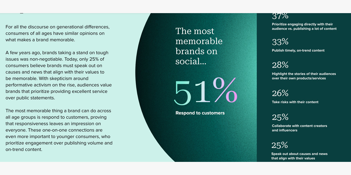 Самое запоминающееся, что может делать бренд, по мнению 51 % опрошенных, — это быть отзывчивым по отношению к клиентам и отвечать на их индивидуальные запросы. Особенно большое значение вовлеченности бренда, в сравнении с частотой и актуальностью контента, отдают молодые пользователи.