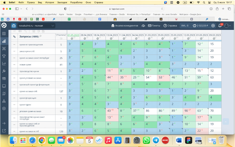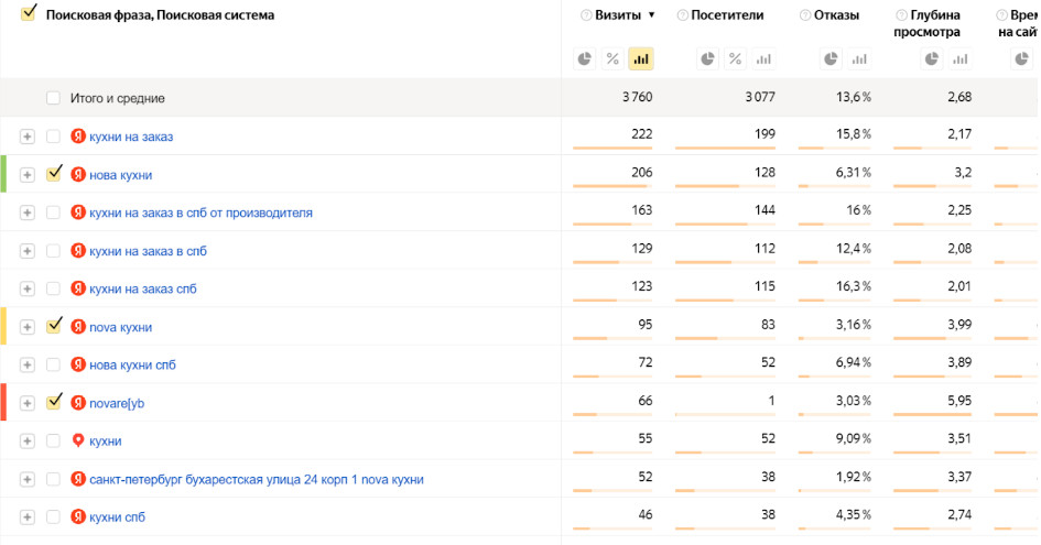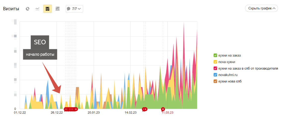 Вот так выглядел приветственный блок старого сайта: Почему он неэффективен: 1. Скользкое предложение: не мотивирует к скорейшей покупке, а скорее настораживает, с чего это такие скидки большие?! 2. Отсутствие методов коммуникации с клиентами: нет кликабельных иконок мессенджеров или чат-бота, который смог бы закрыть часть возражений, ответить на вопрос или обработать заявку (мгновенно при обращении) . 3. Отсутствие кнопки для быстрого целевого взаимодействия (рассчитать стоимость или отправить заявку) . И вот как он выглядит сейчас: Почему он неэффективен? Появилось понятное предложение и единый дизайн, имеется социальное доказательство экспертности. Также есть кнопка заявки и онлайн-консультант. Таким образом, перед началом создания сайта и seo-продвижения мы конкретизировали задачу: 1. Создание нового продающего и функционального сайта, который сможет привлекать больше потенциальных клиентов. 2. SEO-продвижение для генерации целевых заявок за счет наращивания коммерческих запросов. Для решения проблемы мы взялись за создание нового сайта на платформе 1С-Битрикс. Процесс создания сайта включал несколько важных этапов: 1. Маркетинговое исследование: Мы провели детальное исследование рынка и анализ конкурентов, чтобы определить ключевые целевые аудитории и понять, что необходимо писать на сайте, чтобы с него было больше заявок. 2. Дизайн и юзабилити: Наш дизайнер создала стильный и современный дизайн сайта на основе маркетингового прототипа, который привлекает внимание пользователей и обеспечивает удобство использования. Мы уделили особое внимание юзабилити мобильной версии сайта, чтобы пользователи могли легко найти нужную информацию и сделать заявку с телефона. 3. Верстка и программирование сайта: мы сверстали дизайна сайта и интегрировали его в систему управления 1С-Битрикс. Для такого интернет-магазина подошла редакция «Малый бизнес». Одновременно с программистом работал и SEO-специалист, который на этапе создания сайта контролировал корректность кода для выполнения правил поисковых систем, собрал список запросов для продвижения (семантику) , подготовил шаблоны оптимизации мета-тегов, чтобы сайт сразу после наполнения занял бы лидирующие позиции в поисковиках. 4. Наполнение сайта. Также мы осуществили наполнение сайта информацией о продуктах NovaKuhni. Специалисты заказчика предоставили нам изображения и контент, наш контент-менеджер добавил эти данные на сайт. А SEO специалист оптимизировал их, адаптировал под требования поисковых систем. Так мы сэкономили 2 месяца на начальной оптимизации сайта. Однако, создание нового сайта было только первым шагом к успеху. Мы также приступили к выполнению SEO-стратегии, чтобы увеличить посещаемость сайта. Мы провели анализ текущего трафика на сайт и выяснили, что до 80% составляли брендовые запросы. Это означало, что большая часть посетителей уже знала о бренде NovaKuhni и искала его. Это отлично, значит компания за свои 5 лет существования стала известна на рынке. Но для увеличения потока заявок нужно было привлечь и другие коммерческие запросы, более общего характера типа «кухни на заказ» и «кухни от производителя». Структура трафика до начало работы по SEO: Видно, что в основном переходы идут по запросам, содержащим название бренда в различных вариантах написания. Структура трафика посл