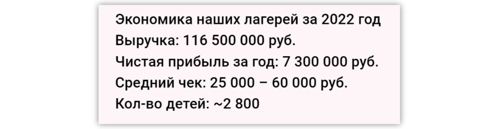 Отношение к детям тоже поменялось. Раньше пионер должен был следить за опрятностью и чистыми руками, а жаловаться было стыдно. Сегодня родители хотят видеть в лагере 5-ти разовое питание по системе шведский стол, вожатые отчитываются родителям на вотсап, что ест ребенок, а если ест плохо, родителю незамедлительно звонят. По санпинам в детском лагере запрещены: майонез, крабовые палочки, сосиски и пельмени только детские, колбаса только докторская, квас нельзя, как алкогольсодержащий. В союзе пионерлагерь — это пионерский костер, труба горниста. Зарядка и линейка Сейчас задача лагеря — это развлечение и обучение. Чтобы удержать внимание детей, требуется больше интерактивности. А конкурировать приходится с мобильными телефонами. В лагерях родители каждый день получают фотоотчет на WhatsApp и могут приехать в любой день повидать ребенка. Экономика современного лагеря и советского пионерлагеря изменилась не сильно. Просто раньше это ложилось на плечи государства, а сегодня на родителя. Сейчас стоимость одной путевки от 25 000 до 60 000. Содержание одного ребенка в лагере обходится от 20 000 до 56 000 руб. Все зависит от условий проживания, длительности смены и выбора программы. Расходы распределяются так = 50 % (аренда базы) + 20 % (персонал в офисе) + 20 % (оплата труда педагогов и инвентарь) + 10 % (маркетинг). Привлечение 1 нового клиента в лагерь нам обходится около 15 000 рублей. Раньше мы арендовали базы, но в детском отдыхе большая часть денег достается именно владельцам базы. Если бы в 2022 году у нас была бы своя база, то 50% выручки — 58 млн, пошло бы нам, а не на сторону. Да, это не чистая прибыль. Нужно оплачивать содержание базы в несезон, закладывать амортизацию, но прибыль выросла бы на минимум 10 млн. То есть, я, как предприниматель без своей базы, зарабатываю с одной путевки — 2 607 руб., а со своей базой 6 178 руб. Плюс базы могут менять условия, они обеспечивают питание, и ты не можешь влиять на это. Нам жаловались на питание, отсутствие москитных сеток, убитые дороги к лагерю, странных охранников. А современные дети и родители хотят уровень комфорта от 3-х звезд отелей. На территории пионерлагеря Мирный предыдущие покупатели земли хотели построить парк-отель, но целевое использование этой земли — детский лагерь. Поэтому они не получили разрешение на строительство, а мы получили и приступили. Сначала я пригласил строителей просчитать проект детского лагеря. За работу и материалы они запросили 1 млрд рублей, срок поставили 2 года. Я не сын олигарха — миллиарда на стройку у меня нет. Я взял оборотные средства своего предприятия, накопления, займы по знакомым, кредиты и начал стройку. Как выяснилось, гораздо дешевле было бы строить с нуля, но это бы подразумевало большие проблемы с согласованиями. Да и идея реставрировать настоящий пионерлагерь показалась мне очень интересной и вызвала приятную ностальгию. Реконструкция одного спального корпуса на 60 мест обошлась где-то в 30 миллионов. Мы хотели быстро окупить часть вложений и открыться в этот сезон, но Роспотребнадзор не выдал часть разрешений. За трагедию с утонувшими детьми в Карелии посадили именно главу Роспотребнадзора Калерии. К нему на соседние нары никто не хочет, поэтому проверяют жестко. Это было очень болезненно, так как не получилось быстро окупить часть вложений. Из-за кассового разрыва нам пришлос