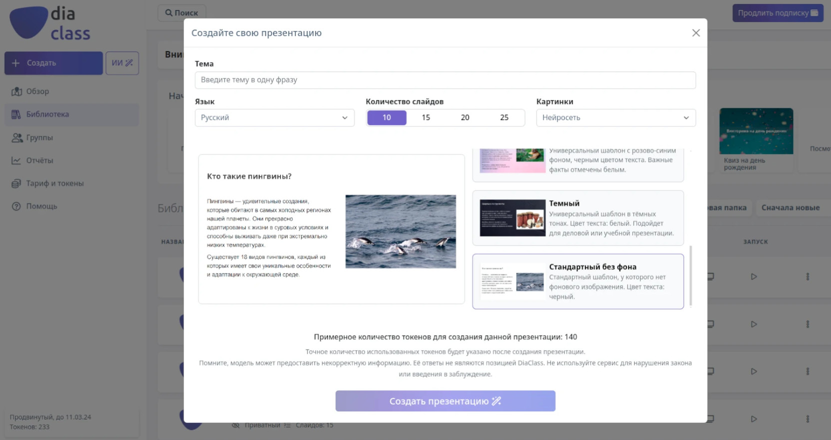 Проект уже полностью готов и доступен на платформе DiaClass как бесплатно, так и по ежемесячной подписке за 410 и 900 рублей в зависимости от тарифа. С повышением цены увеличиваются возможности ИИ, количество участников при голосовании и слайдов, но пользователям доступен бесплатный пробный период и даже скидка до 30% для сотрудников образовательной сферы или при участии в бонусной программе. Для того, чтобы начать пользоваться, нужно всего лишь зарегистрироваться на платформе с помощью email и Вконтакте.