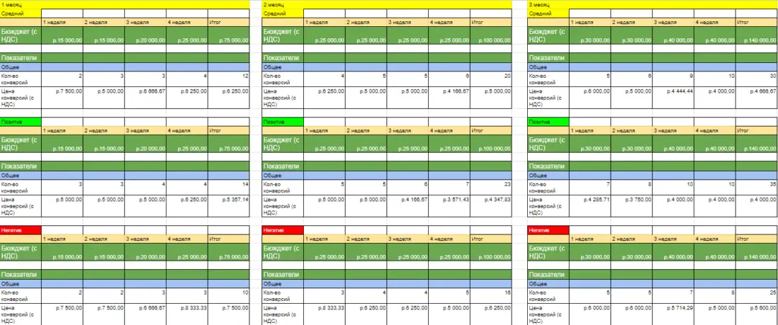 Первым делом мы составили медийный план, в котором рассчитали по месяцам динамику цены заказа, которую клиент может ожидать, и согласовали его.