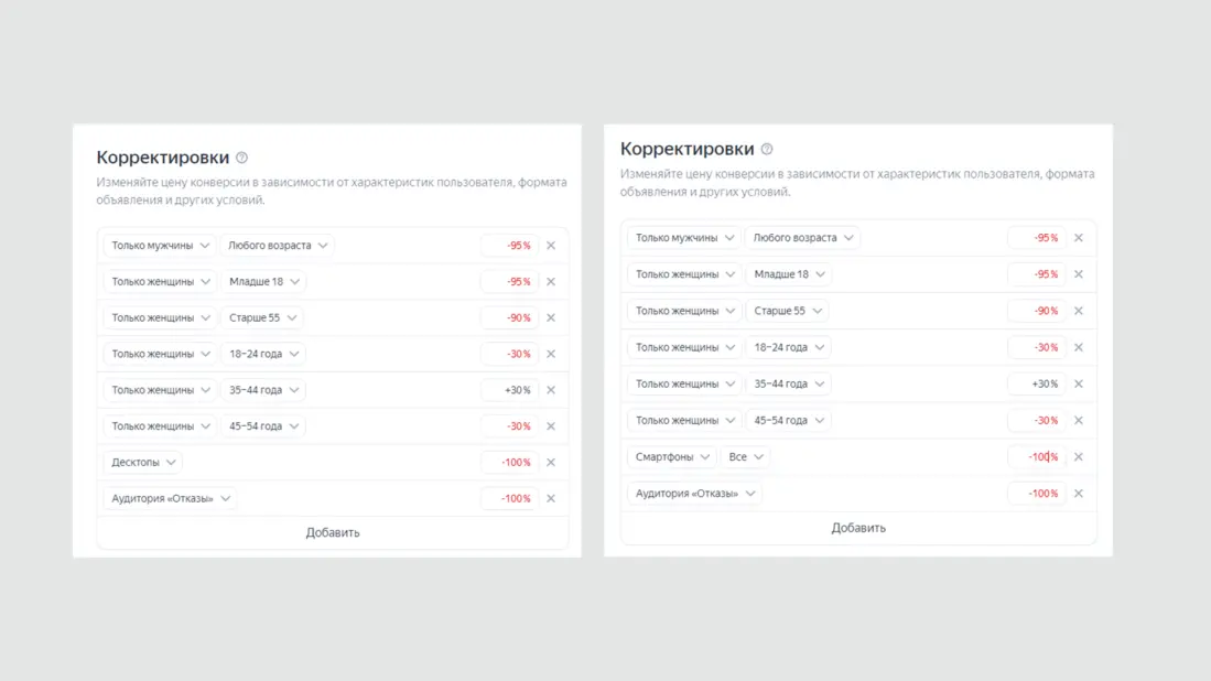 Сделали как позитивный и средний, так и негативный прогнозы по цене заказа. Клиента устроила планируемая динамика, а мы приступили к работе. Наша главная цель в первый месяц — это протестировать все основные инструменты и целевые аудитории ЯД. Поэтому далее мы:, 1) Проанализировали статистику, собранную предыдущим агентством и учли опыт их наработок. Внесли в РК самые базовые корректировки ЦА. 2) Запустили первые кампании: — Товарная кампания — Мастер кампания в авто-стратегиями — Все основные ретаргет аудитории 3) По мере «раскачки» рекламных кампаний, мы расширяли сборку, добавляя в неё: — Смарт-баннеры look-alike и ретаргет аудитории — look-alike аудитории по целям метрике и базе CRM — Широкие и сезонные аудитории по ключам — Целевые и около-целевые аудитории по ключам — Аудитории по целевым и косвенным интересам — Динамические кампании по категориям товара Получили следующие результаты: Бюджет: 554 996 р Кол-во заказов: 119 шт Цена заказа: 4 663 р Средний чек: 15 750 р Итог: есть результат, с которым можно работать. В первый месяц работы мы выявили успешные связки, добыли необходимую статистику для корректировок и подготовили РК к следующему этапу — снижение цены заявки при сохранении текущего бюджета. Важный момент! Результаты в первом этапе сильно зависят от оптимизации проекта, так как запускается много тестовых кампаний — нужно следить за основными метриками РК. Советуем оценивать не только количество и стоимость конверсий, но и качество самого трафика. Основная цель на этот период — снижение цены заявки для дальнейшего масштабирования РК. 1) Сделали упор на работающие связки. В нашем случае это большинство стандартных инструментов и аудитории Яндекса: Товарная и мастер кампании, смарт-баннеры, аудитории конкурентов по ключам и интересам, аудитории по ключам категорий товара, целевые широкие запросы, аудитории по интересам, look-alikе и все основные ретаргет аудитории. Рекомендуем эти аудитории тестировать в самую первую очередь. 2) Внесли необходимые корректировки по РК. Отсекли большую часть нерелевантного или невыгодного трафика с помощью стандартных корректировок ЯД. Просегментировали кампании по: а) Возрасту Выявили наиболее выгодные категории возраста, в которых % конверсии самый высокий и сегментировали кампании по этим категориям b) Устройствам Некоторые аудитории было выгоднее показывать на смартфонах, в основном это кампании на РСЯ. А некоторые аудитории на ПК — в основном это аудитории в ПОИСКЕ. 3) Оптимизировали семантику по ключам. Самые выгодные ключи мы вывели в отдельную кампанию, чтобы получать по ним больше трафика, и отключили невыгодные. Под невыгодными мы подразумеваем ключи, которые приносят нам конверсию, но при этом цена конверсии выше средней по РК. 4) Оптимизировали показы по ГЕО Сделали упор на города, в которых % конверсии выше, чем средний по РК, а также исключили города, в которых был самый низкий % выкупа (по обратной связи клиента). Получили следующие результаты: Бюджет: 275 540 р Кол-во заказов: 91 шт Цена заказа: 3 027 р Средний чек: 15 478 р Итог: Снизили стоимость заявки на 38%, при сохранении бюджета за счет грамотной оптимизации РК. Нам удалось достичь всех поставленных целей, которые мы ставили в начале сотрудничества: Достичь этих результатов нам удалось за счет отлаженных процессов запуска РК, грамотного планир
