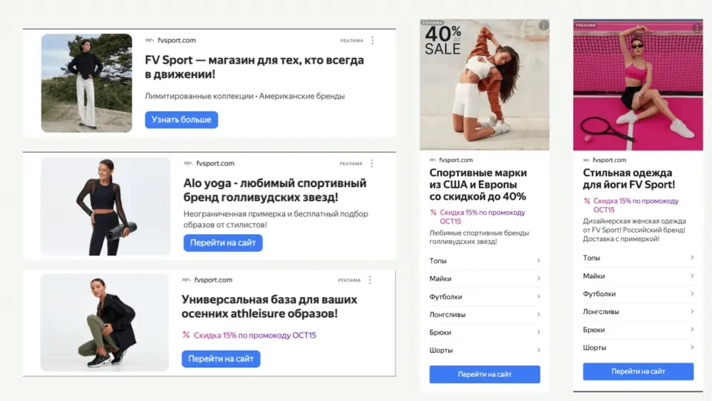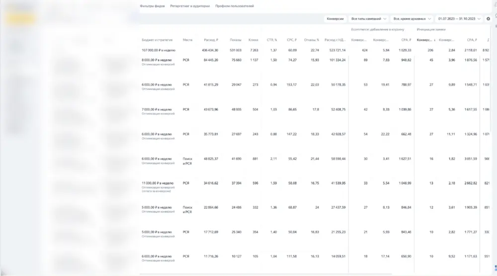 В первый месяц провели большое количество запусков и протестировали суммарно около 30 аудиторий. Если упустить поднятие старых клиентов через ретаргет и витальные (брендовые) запросы, то успешными аудиториями были кампании в сетях с разделением по категориям одежды и по общим запросам, которые содержат в себе базовые фразы «одежда для занятий спортом» и подобное.
