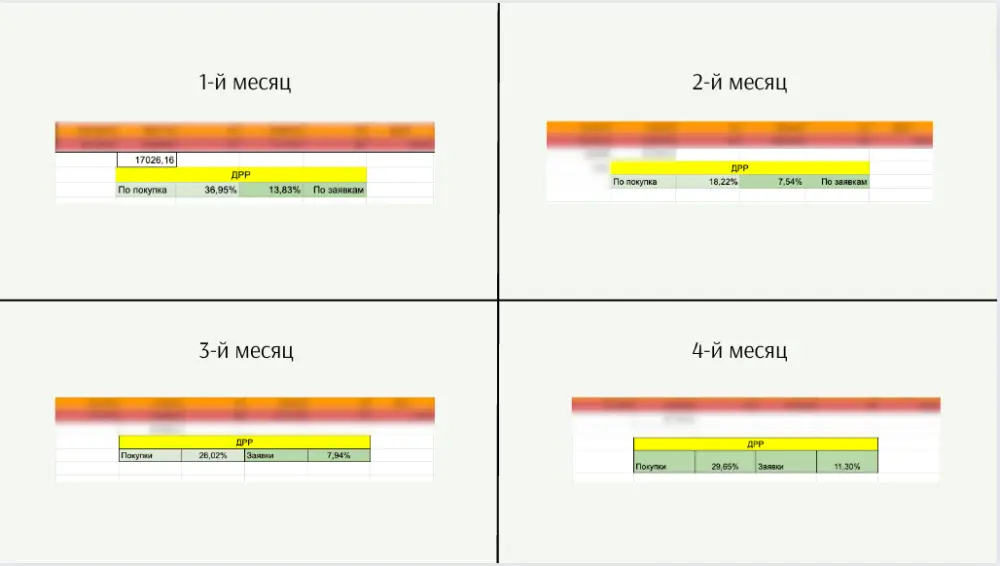 Не смотря на то, что в первом месяце мы не можем поставить перед собой цель по низкой стоимости заявки/покупке и, как правило, сильно отличается от рекламы на 3-4 месяц (работает с меньшей эффективностью), мы смогли в первый месяц показать ДРР ниже 40%. Далее этот показатель только улучшился и удерживался на уровне менее 30%.