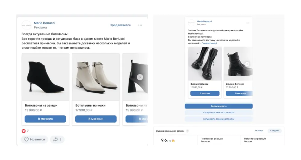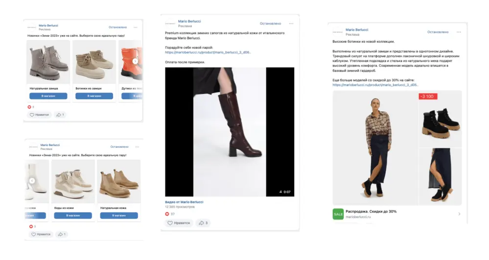 Через парсеры нашли конкурентов со средним чеком от 10 тыс.руб., из которых собрали участников и недавно вступивших к ним. Также запустили кампании на ключевые запросы: женские ботильоны, зимняя обувь и брендовый запрос (Mario Berlucci).