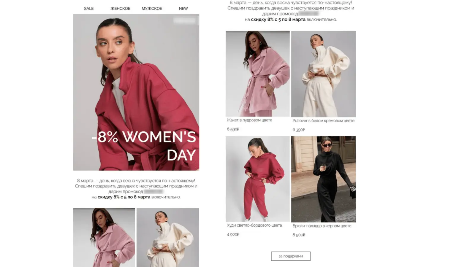 2. Сбор товаров бестселлеров Проанализируйте статистику продаж за прошлый год: какие товары шли в продажу лучше, какие категории были наиболее просматриваемые, что чаще всего добавлялось в корзину. Такой анализ облегчит выбор категорий, товаров и предложений которые следует презентовать на распродаже в первую очередь. Такие «бестселлеры продаж» можно транслировать на тех площадках, на которые будет направлен основной упор праздничной распродажи: 1. Email-маркетинг — сделайте макеты, в которых покажите пару популярных товаров, на которые будет распространяться скидка. Краткое описание условий и сроков акции; 2. Контекстная реклама — можно показать самые продаваемые товары на креативах. Яркое фото, текст и заголовок о размере скидки, срокам и условиям — все это эффективно себя отрабатывает, при корректно оформленном и наполненном объявлении. Не забудьте добавить промоакции рекламные кампании и быстрые ссылки; 3. Telegram Ads — вести на посты с телеграм канала, в котором описаны условия распродажи и подборка товаров на которые распространяются скидки. Объявления следует протестировать с различной подачей: с написанием цены до и после начала акций, так и кратко описать происходящую акцию на канале бренда; 4. Закупы рекламы у инфлюенсеров — подготовить продающий макет и добавить в него товары бестселлеры, которые выявили при анализе топа продаж. Помните о бартере — так ваши изделия будут наглядно показаны в кадре, а стильный образ в изделиях на инфлюенсере привлечет еще больше внимания. Также данный способ будет комфортен начинающим брендам, которым легче работать по бартеру, чем на коммерческих условиях. 3. Наличие товаров Важный этап подготовки к успешной распродаже — это полное наличие товаров на сайте. Проанализировав спрос на прошлый год, будет не сложно понять, на какой товар посетители будут больше обращать внимания. На них и следует в первую очередь увеличить количество товаров из наличия. Но и про другие товары, которые вы продвигаете в рекламе, забывать не стоит. 4. Подготовка сайта Дни распродажи знамениты не только щедрыми скидками, но и тем, что неподготовленный сайт не выдерживает резкого наплыва трафика и просто ломается. Этот момент максимально важен, ведь именно от сайта и скорости его работы будет зависеть то, сколько заявок на покупки будет оформлено. О чем также не стоит забывать: — Отдельно созданная категория под SALE, с фильтрами по стоимости, цветам и размерам товаров и др; — Все необходимые товары отмечены значком распродажи, показана новая и старая цена, размер скидки в %; — Виджет с обратной связью, чтобы посетители могли оперативно получить ответ на свой вопрос по поводу доставки и прочих условий акций; — Раздел с дополнительными товарами «Смотрите так же», которые понадобятся к товару или образу; — Страница «Спасибо» после оформленного заказа, на которой будут показаны другие специальные предложения и сроки их действия, которые также могут заинтересовать посетителя и простимулировать на следующую покупку. — Предлагая скидки на популярные и продаваемые товары — увеличится объем трафика приходящий на сайт. Также можно установить скидки на те товары, которые бренду выгодно будет продать. По итогу, перешедший трафик с акции будет просматривать популярные товары и сможет увидеть остальные предложения,