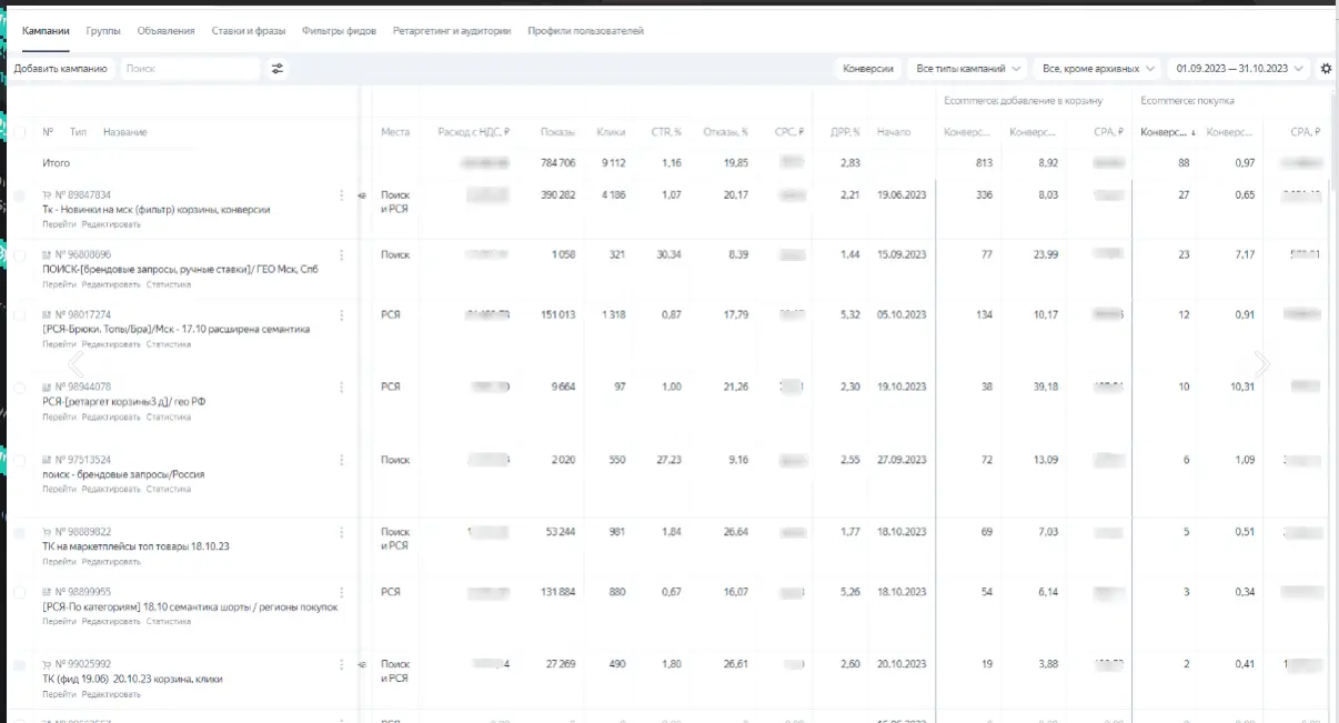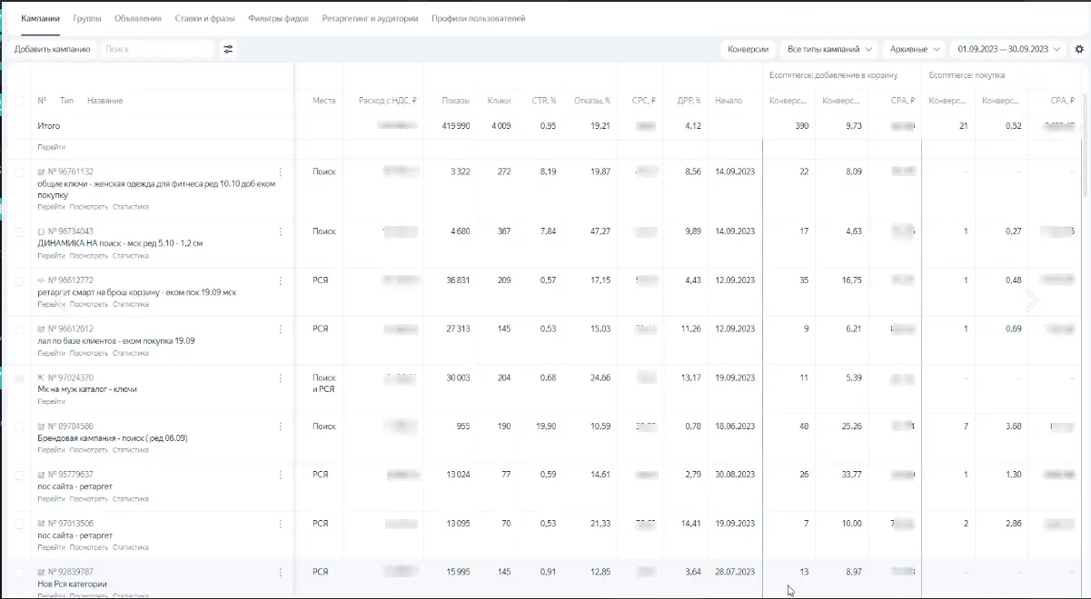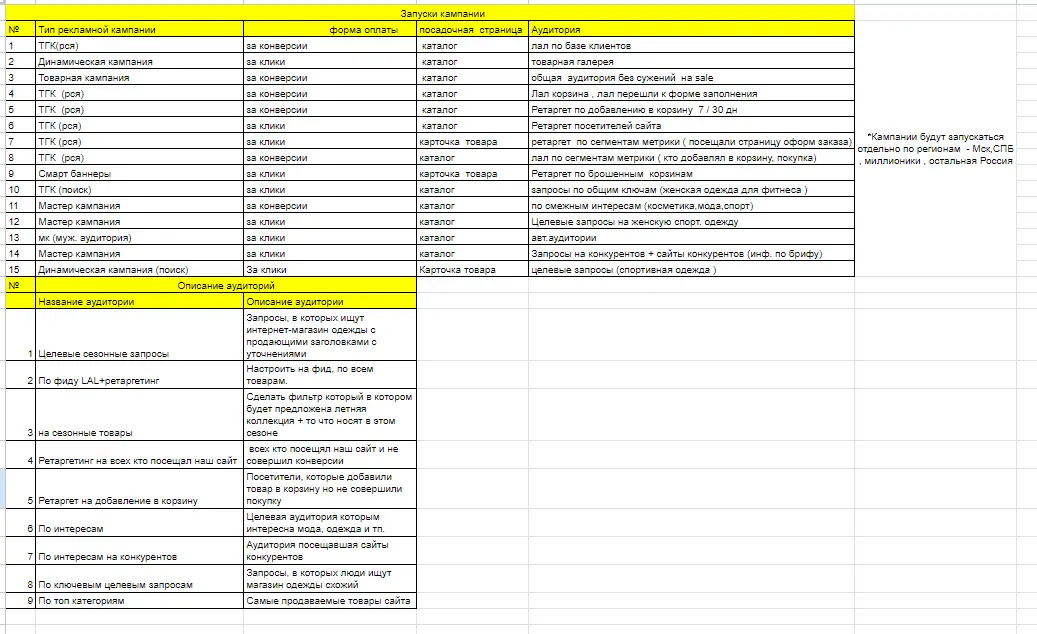Перед началом работы подготовили план запусков с аудиториями, конкурентами, креативами, заголовками, согласовали с заказчиком и приступили к сборке рекламных кампаний.