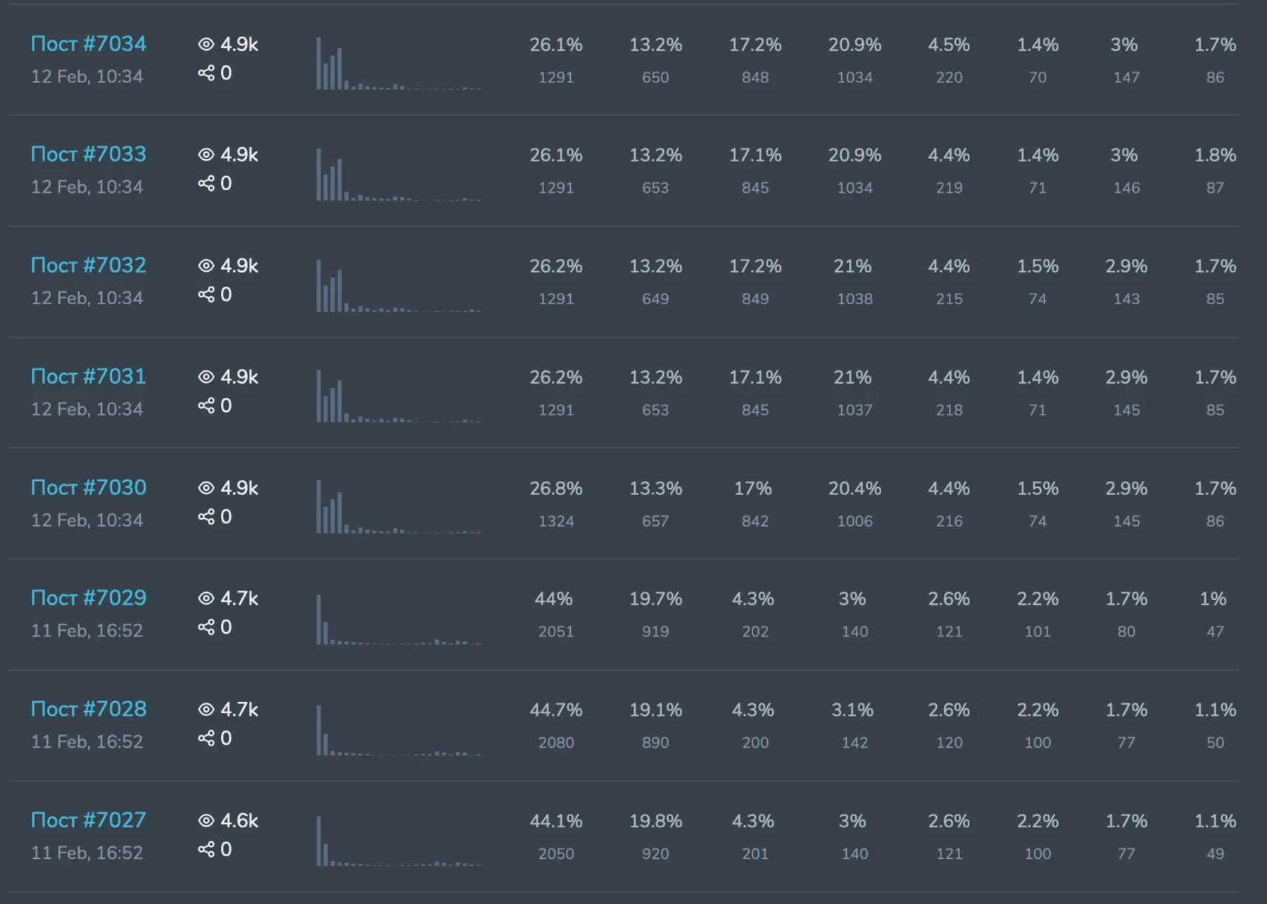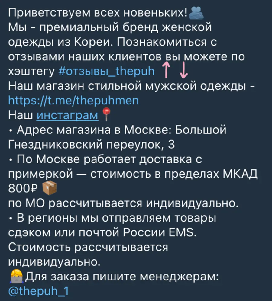 ❌При анализе эффективности рекламы обратили внимание на плохую отдачу. Несмотря на рекламные охваты в десятки тысяч, бренд получает, скорее всего, дорого подписчика, в пределах 800-1200 рублей. Конечно, проблема может быть не в креативе, а в каналах, где размещается реклама. Каналы проанализируем дальше. В основном посевы происходят в следующих нишах: психология, мода, новости, трэвел, блоги. В примерном процентом соотношение посевы в тематических каналах — 85%, посевы у блогеров — 15% Ключевая задача канала продавать свою одежду. Поэтому считаем, что в данном случае будет эффективнее следующее процентное соотношение: 40% — тематические каналы 60% — личные блоги. Почему именно так? В тематических телеграм-каналах в большинстве своём неосознанная и не платежеспособная аудитория. Тут нужно понимать разницу между теми, кто ХОЧЕТ купить одежду бренда и теми кто МОЖЕТ купить одежду в T H E . P U H. Конечно, в тематических каналах есть аудитория, которая может купить одежду бренда, но если мы говорим о коэффициенти эффективности (ROI), то она будет явно выше у личных блогах. Личные блоги в большинстве своём читает платежеспособная аудитория. Процент доверия подписчиков к таким блогам выше, чем у тематических каналов, а продажи идут через высокое доверие. Были проанализированы февральские посевы. Только за февраль было обнаружено более 20 каналов с накрученными показателями. Если с них и были подписки, то вероятнее всего большая часть — это боты. Пример анализа накрученных каналов. 1. МУД — посевы были 19 февраля Признаки накрученной активности Такие просмотры на посты возможны только через сервисы накрутки. Сам канал заливался точечными закупами и крупными заливами аудиторией. Скорее всего, таким образом они хотели прикрыть факт залива ботов на канал. 2. Знать — посевы были 16 февраля Признаки накрученной активности Такие просмотры на посты возможны только через сервисы накрутки. Чтобы не засорять эфир, ограничимся двумя примерами, на деле подтверждено ~20 полностью накрученных каналов ежемесячно. Цену у администраторов не запрашивали, но если учесть, что в каждом накрученном канале минимальный охват поста был 4-8 тысяч просмотров, то цена, вероятно, составит минимум 3-5 тысяч за размещение. Соответственно, по минимальным расчетам, бренд тратит в месяц на накрученные каналы минимум 50 тысяч рублей. Если сравнивать статистику с другими месяцами, цифры колеблются в таком же диапазоне.То есть за год уходит более 600 тысяч рублей на накрученные каналы. А что такое 600 тысяч, распределенные неэффективно для бренда одежды? Цена клиента в одежде варьируется в диапазоне от 1500 до 5000 рублей. Если мы поделим верхнюю цену за клиента (5000) на неэффективно потраченные 600 тысяч, то получим 120 недополученных покупателей. А сколько в деньгах будет 120 клиентов для T H E . P U H? При приблизительных расчетах средний чек бренда около 13 тысяч. Помимо впустую потраченных 600 тысяч мы получаем 1,5 миллиона недополученной выручки. Напоминаем, что это минимальные расчеты, а учитывая, что у бренда действительно стильная и качественная одежда, вероятно, у них высокий процент повторных покупок. То есть неэффективно потраченные 600 тысяч за 2023 год легко превращаются в несколько миллионов недополученной прибыли уже в 2024 году. 1. Сменить стратегию посевов 40% — тематические каналы 60% — личные бло