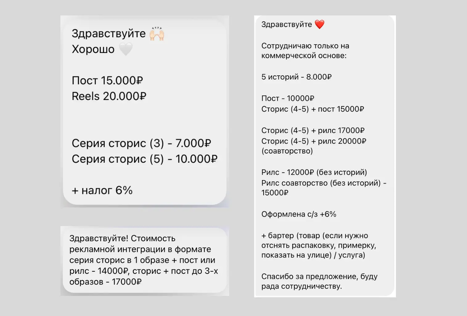 5) Происходит обмен условиями от блогера (прайс, условия размещения, форматы размещения, способ оплаты);